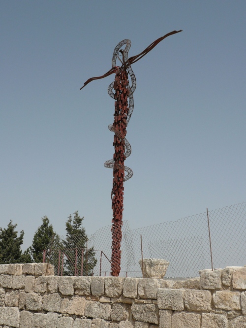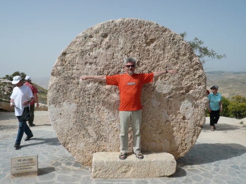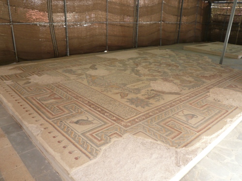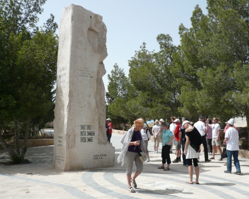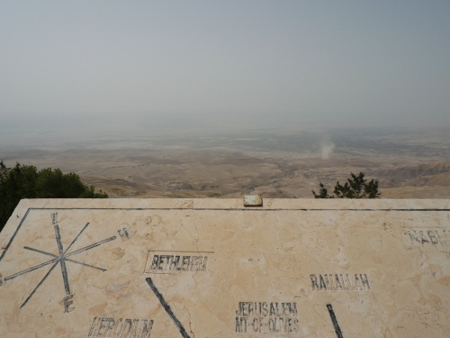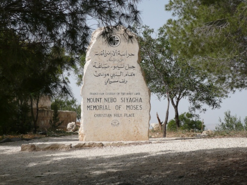 Wir fahren weiter in die Berge Richtung Madaba. Der Bus schlängelt sich über zig Serpentinen hinauf zum Berg Nebo. Unterwegs sehen wir wieder Beduinen mit ihren Ziegenherden. Der Berg Nebo, wo auch Moses starb, zieht seit Beginn der Christenheit Pilger an. In der Bibel heißt es: Und Moses stieg aus den Gefilden Moabs auf den Berg Nebo, auf den Gipfel des Pisga gegenüber Jericho…Die Aussicht bei klaren Wetter ist fantastisch. Der Blick geht über das Tote Meer und Jericho, angeblich sogar bis Bethlehem und Jerusalem. Da die Moseskirche gerade restauriert wird, kann man die Mosaiken in einem Zelt aus Ziegenhaardecken besichtigen.