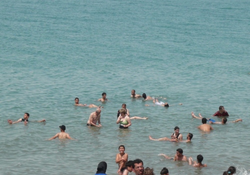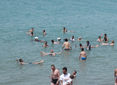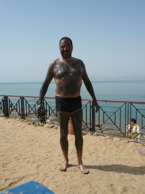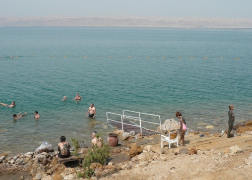 Nach kurzer Pause geht es in Badesachen direkt ins Tote Meer. Ich kann mich persönlich überzeugen, das Wasser trägt einem ohne Schwimmbewegung. Vorsicht, wer eine offene Wunde am Körper hat. Es ist reines Salzwasser mit einer sehr starken Konzentration. Wenn man das Wasser verlässt, hat man das Gefühl, richtig eingeölt zu sein.
