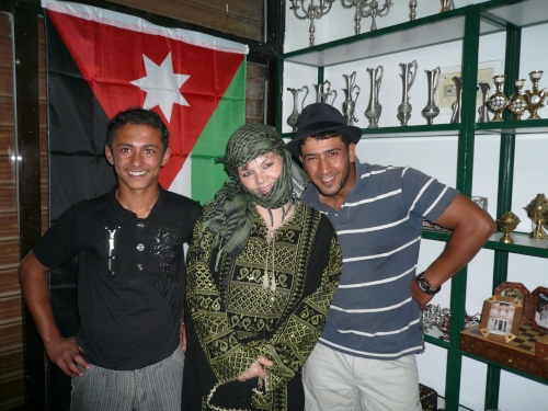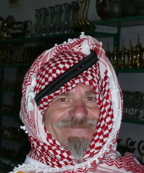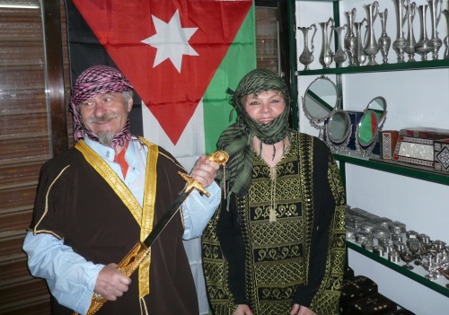 Es geht weiter durch Madaba das fruchtbare Gersten- und Weizenfelder hat. Wir fahren durch eine einsame Landschaft. Hier und da befinden sich kleine Siedlungen am Wegesrand. Unser Ziel ist Petra. Nördlich der Stadt verläuft der alte Handelsweg der Weihrauchstraße und Knotenpunkt vieler Handelrouten die Damaskus, Ägypten, Syrien, Jemen und das Mittelmeer verbanden. Nach dem Abendbuffet gehen wir in die Stadt und haben ein Erlebnis der besonderen Art. In einem kleinen Laden für alle möglichen Souvenirs werden wir eingekleidet nach Beduinenart. Der Ladenbesitzer und seine 2 Söhne haben einen tierischen Spaß, uns zu verkleiden. Wir machen alles mit und machen dabei tolle Erinnerungsfotos.