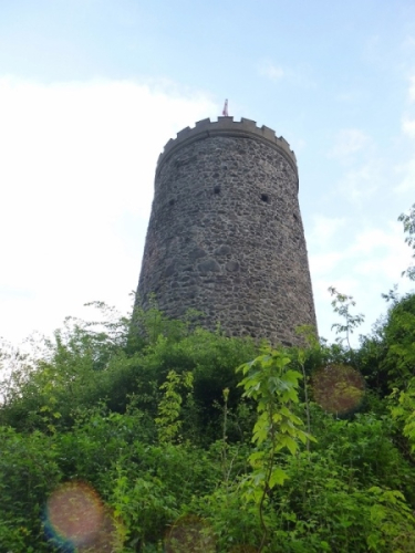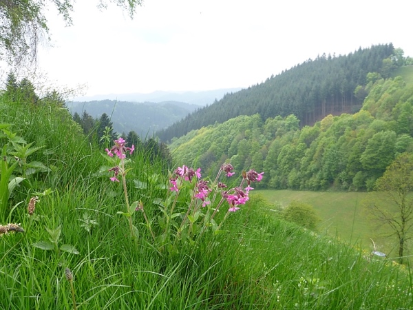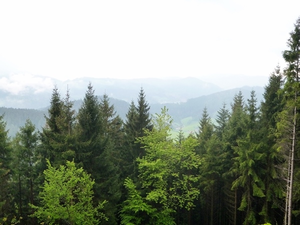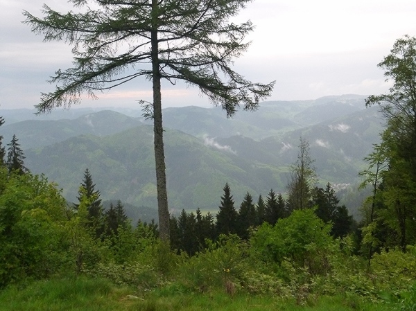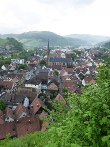 Am Bahnhof Hausach vorbei durch die Fußgängerzone ging es dann am Ende des Städtchens gleich wieder steil bergauf zur Burg Husen. Von hier oben hatten wir einen tollen Ausblick auf das tief unter uns liegende Hausach. Die nun folgenden knappen 20 Kilometer bis zum Ziel an der Wilhelmshöhe sollten noch einmal sehr anstrengend werden. Gleich die ersten 4 Kilometer brachten uns auf extrem steilen Pfaden auf den 790 m hohen Farrenkopf (km 70,6), der uns einen der wenigen, nebelfreien Blicke über die Schwarzwaldberge eröffnete.