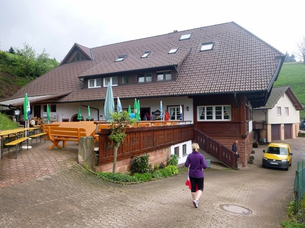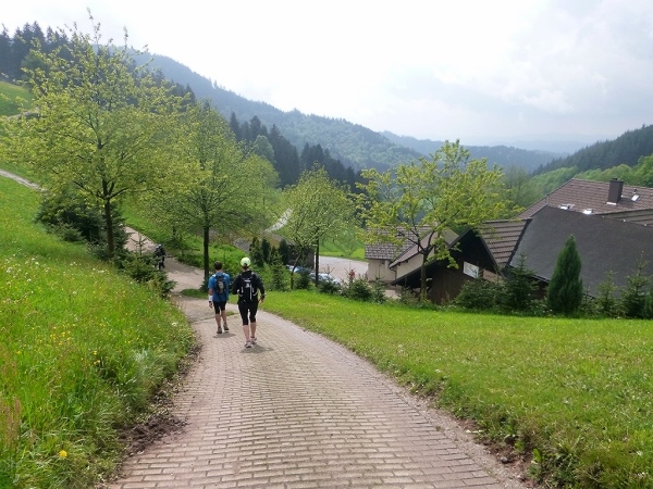 Kurz nach dem Harkhof an der Kreuzsattelhütte sollten wir den kürzeren, steileren Anstieg wählen und nicht nach rechts die Brandenkopf-Variante laufen, so unser Streckenchef Harald am Vorabend beim Briefing.Bei km 66 erreichten wir dann Hausach im Kinzigtal (238 m), an der Eisenbahnlinie der Schwarzwaldbahn nach Singen gelegen.