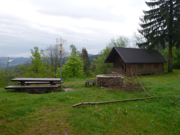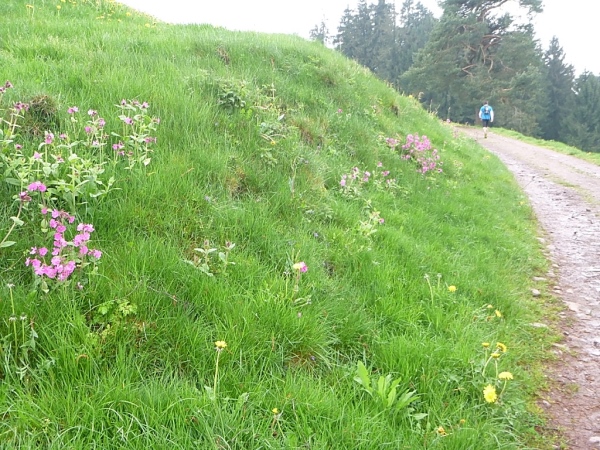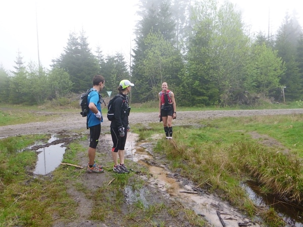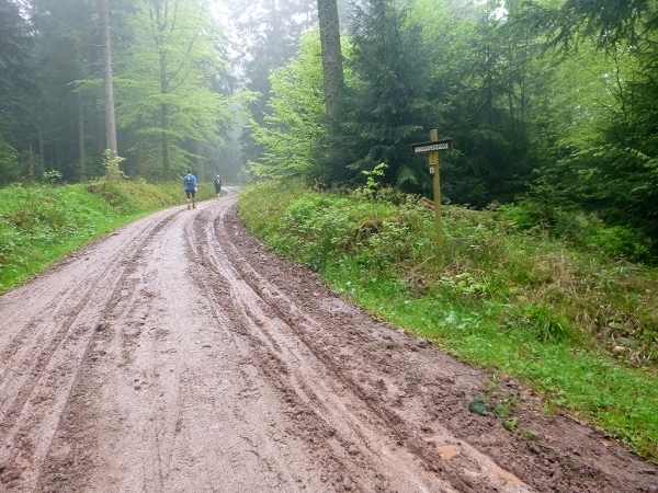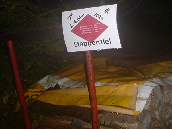 Gleich darauf wurden unsere Beine mit einem steilen Abstieg bis aufs Letzte gefordert. Ein zweiter Steilhang hinauf zur Prechtaler Schanze (km 75,5/835 m) am Sendemast vorbei. Die Prechtaler Schanze zeigte uns die Überreste einer militärischen Befestigungsanlage aus dem 17. Und 18. Jh., als dieser Berg ein strategisch wichtiger Punkt im Verteidigungssystem gegen Frankreich darstellte. Kaum hatten wir die Prechtaler Schanze passiert, kamen wir in die Abenddämmerung und mussten unsere Stirnlampe zücken, um im dunklen Wald nicht über Wurzeln und Stein zu stolpern. Als es dann auch noch zu regnen begann, wurde der bereits durchweichte Waldweg immer schwerer zu laufen. Ich zog auch schon bald meinen Regenponcho drüber, um nicht völlig auszukühlen.