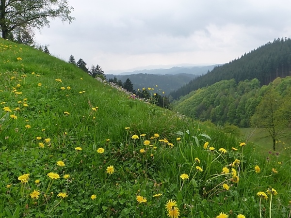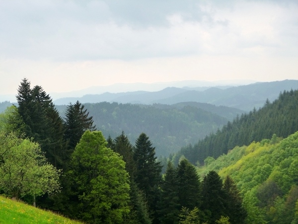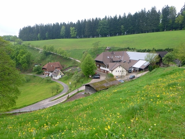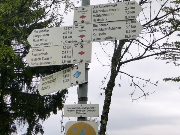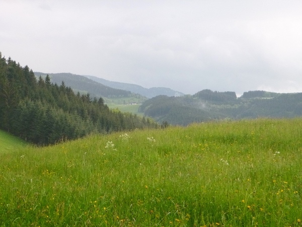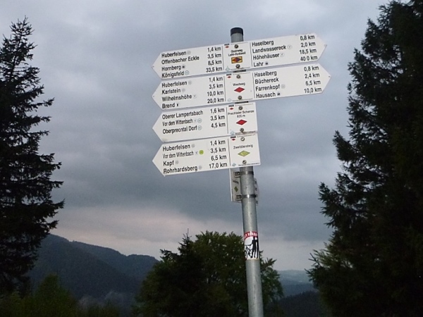 Am Naturfreundehaus Brend (km 10/1149 m) vorbei kamen wir dann nach Neueck (km 16) unweit von Furtwangen, direkt an der Bundesstraße B500. Am Gasthaus Kalte Herberge (km 22) vorbei und weiter bis zum Gasthof Schweizerhof (km 27,8) wechselten wir ständig die Straßenseite der Bundesstraße, einmal links der Teerstraße, einmal rechts davon.Erst danach hatten uns der Wald und die Schwarzwaldwiesen wieder, um über den fast 1200 m hohen Weißtannenhöhe zu laufen. Nun ging es in etwa 5 Kilometern teils auf asphaltierten, einspurigen Wirtschaftswegen steil hinunter nach Titisee (km 42,3/858 m).