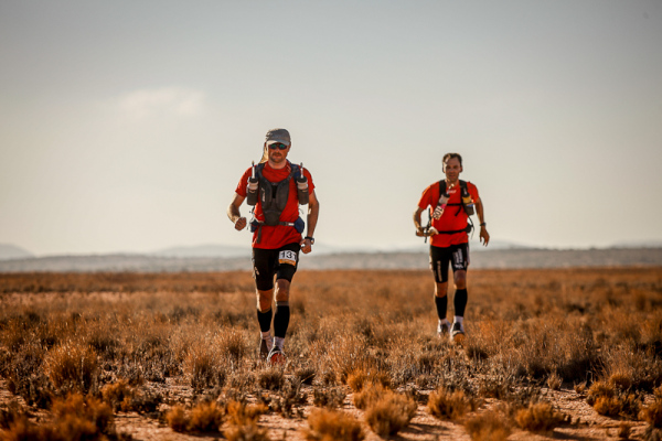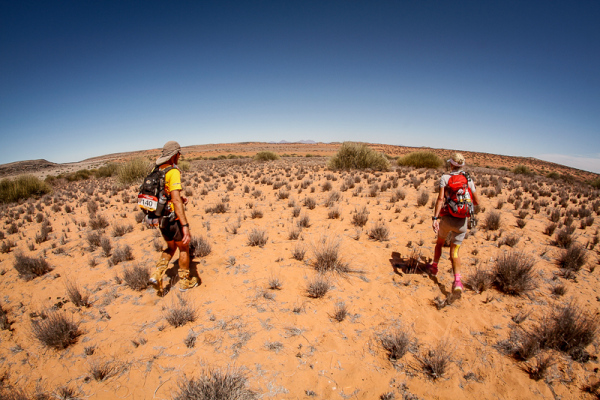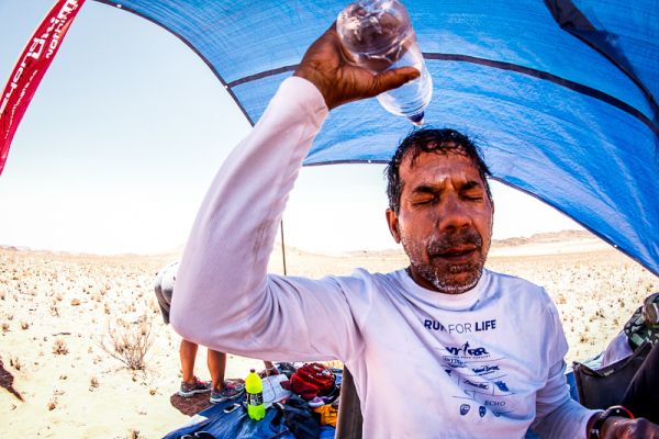 Etappe 2 geht heute eher über unebene Jeeptracks, auf denen aber zügiges Laufen möglich ist. Nach Checkpoint 2 muss der führende Andrew Clarke abreißen lassen und ich bin mit Alan Leed und Michele Ufer aus Deutschland unterwegs. An Checkpoint 3 und 4 müssen alle Läufer nach einer neuen Vorgabe eine 10 minütige Zwangspause einlegen. Die Ärzte haben Sorge wegen der großen Hitze und weiteren Ausfällen.