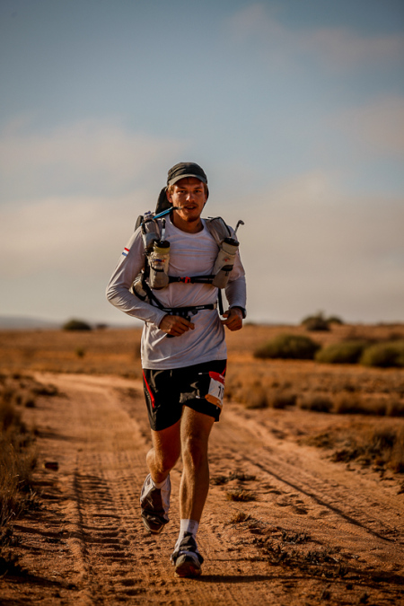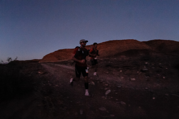 Es folgt die letzte Etappe über 100 km mit Start beim ersten Sonnenstrahl. In der Gesamtwertung liegen Alan und ich sehr dicht beieinander. Er ist mit zwei Minuten Vorsprung auf Platz 1, ich folge auf Platz 2 und schon 20 Minuten später kommt Andrew Clarke. Die übliche 5er Gruppe läuft zusammen vorne weg und bevor es zu den Dünen kommt, sind Andrew und ich schon mit leichtem Vorsprung unterwegs, der am Ende der Düne auf 20 Minuten angewachsen sein wird. Wir gewinnen gemeinsam die „king of the dunes“ Etappe als die schnellsten Läufer in den Dünen zwischen Checkpoint 2 und 4. Das Tempo ist ungewöhnlich hoch für eine 100 km Etappe in der Wüste. Klar ist, dass Andrew seinen 20 Minuten Rückstand in der Wertung zu Alan aufholen möchte, um doch noch den 2. Platz zu erreichen, oder zu gewinnen. Ich hingegen habe den Plan, ihn zu kontrollieren und in seiner Nähe zu bleiben.