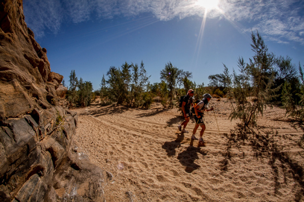 Ich betrachte das Rennen nun aus einer neuen Sicht: ich baue mir das um in zwei schnelle 10 km Läufe mit Trinkpause und laufe den Kollegen davon. An diesem Tag bin ich so zügig unterwegs, dass das Course making team die Markierungen auf den letzten 8km noch nicht fertig hat. Die Helfer zeigen mir den Weg per Handzeichen ins Ziel. Ich habe Alan 20 Minuten und dem führenden Andrew sogar 50 Minuten abnehmen können. Michele Ufer hat Spaß an der Veranstaltung gefunden und hat seine Knieprobleme des ersten Tages überstanden. Er kommt heute als Zweiter mit 20 Minuten Abstand hinter mir ins Ziel. Ein langes Flusstal mit sehr weichem Sand, in dem die Hitze steht, hat allen arg zugesetzt. Für mich ist es aber die Stelle an der ich wusste, dass der Ausgang dieses Rennens noch offen ist.