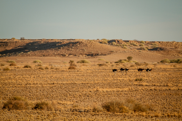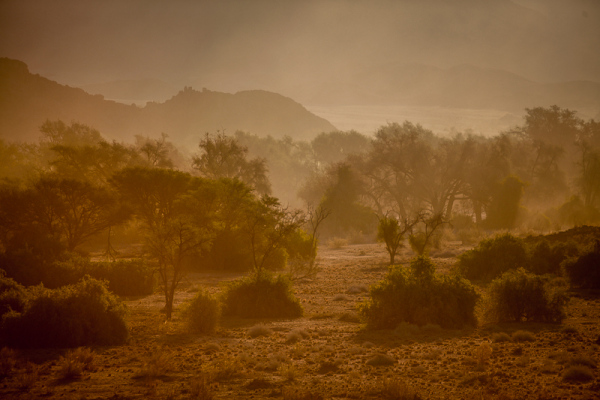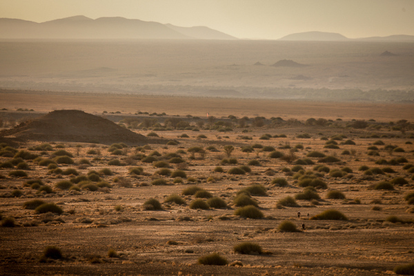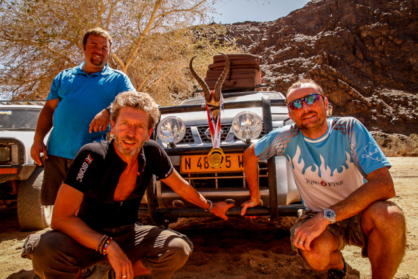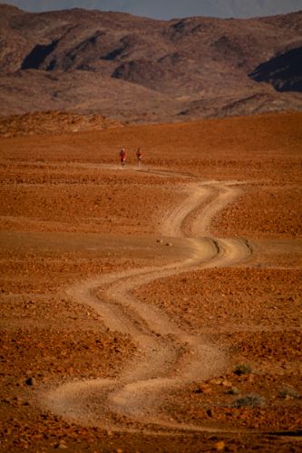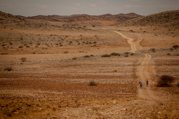 Am nächsten Morgen starten wir bei Sonnenaufgang auf die 35 km lange Etappe entlang des Brandberges, der sich auch die Ehre gibt, in der aufgehenden Sonne ganz in Rot zu erscheinen. Daher auch der Name Brandberg. Diese Etappe ist ja eher eine Sprintdistanz. Von den Höhen des Brandberges geht es runter in ein riesiges Flussbett. Der junge Edwin Snippe ist mein Begleiter bei diesem zügigen Ritt ins Tal. Alan und Andrew können das hohe Tempo nicht halten und kommen 5 Minuten später rein.