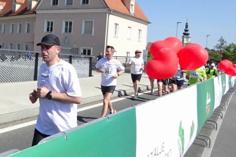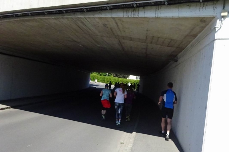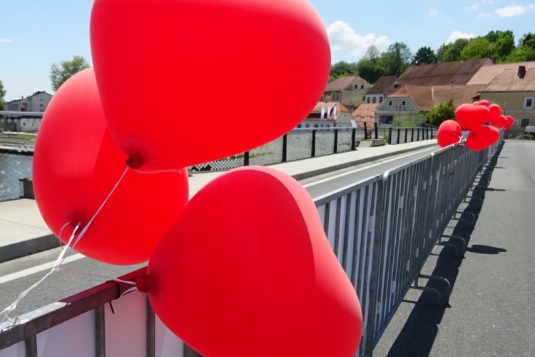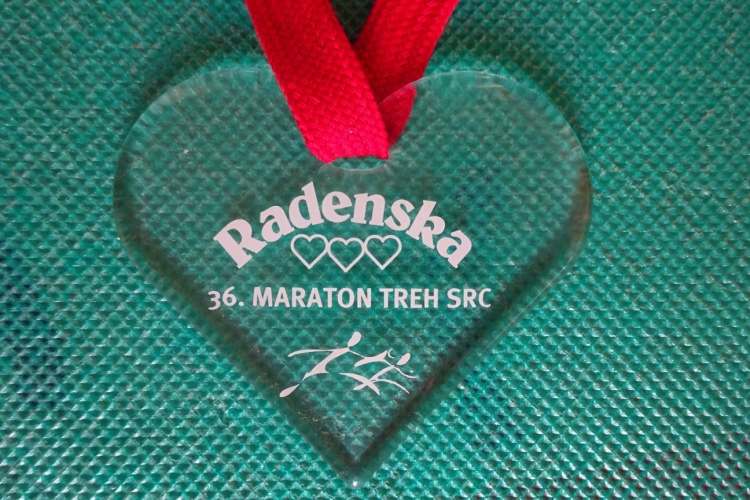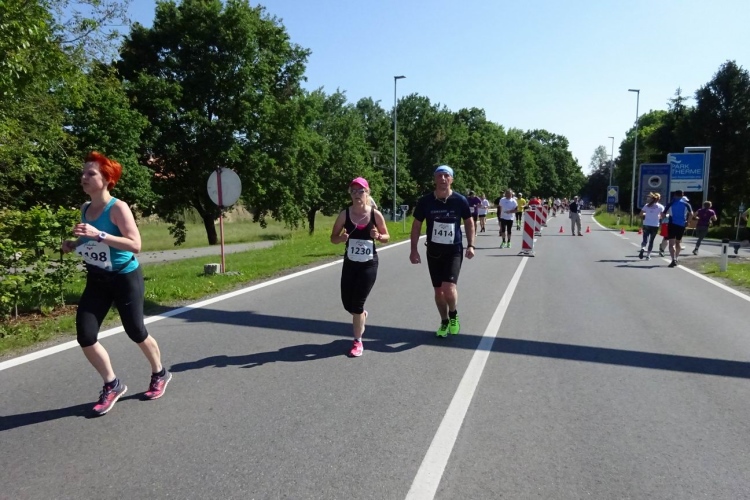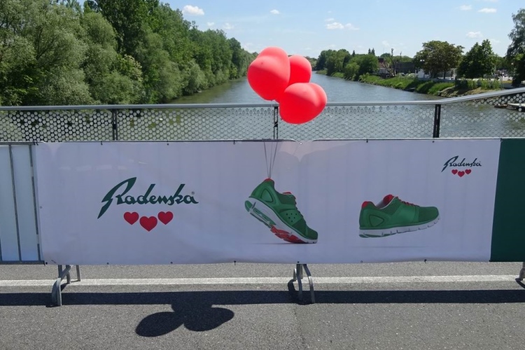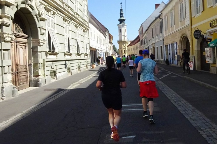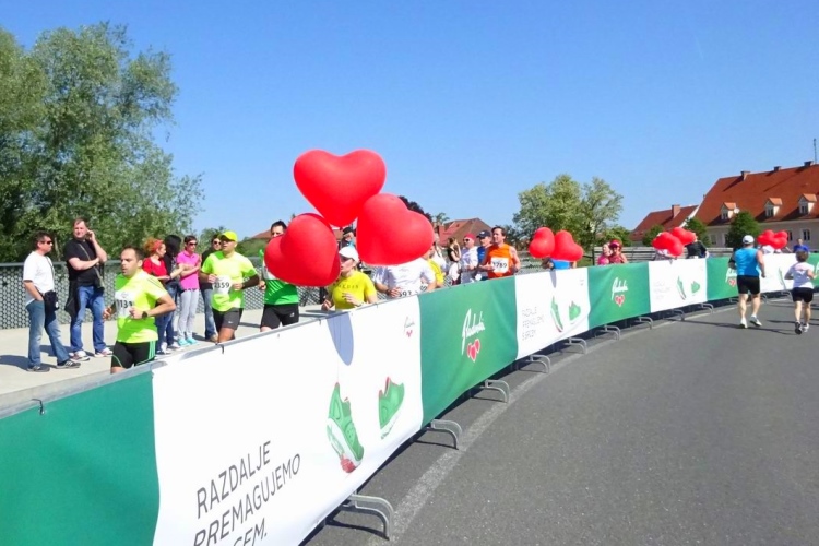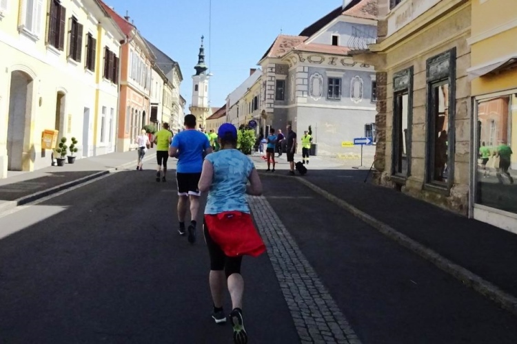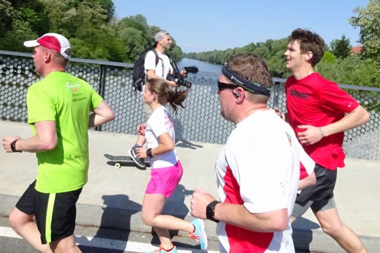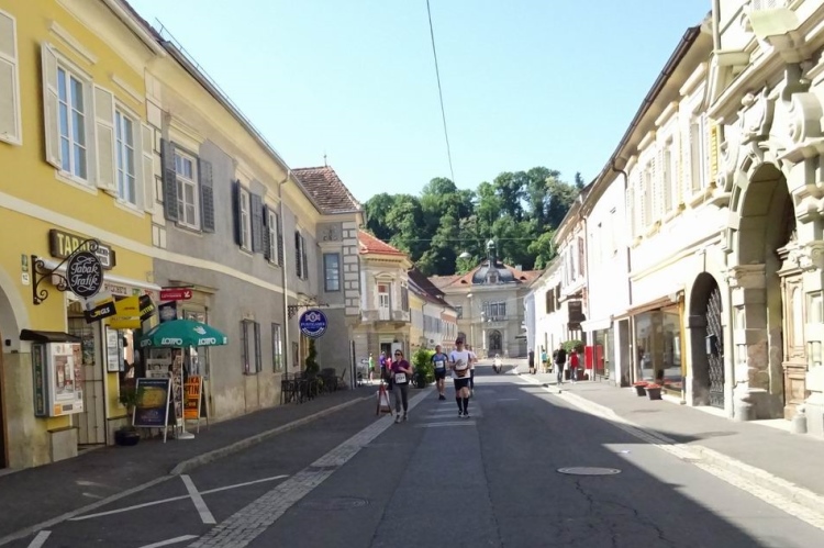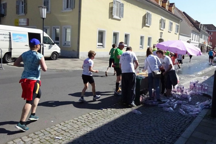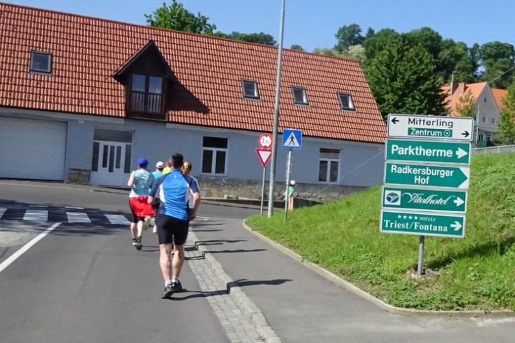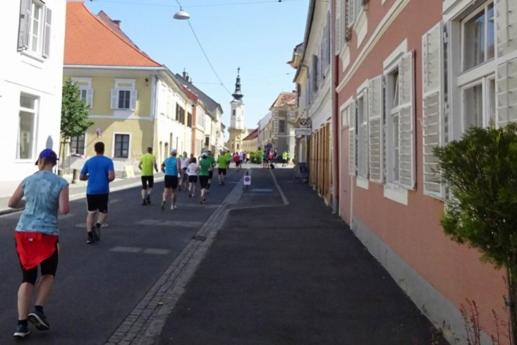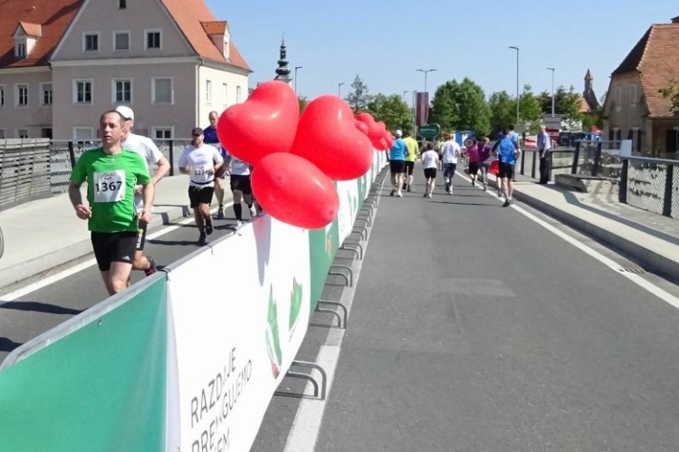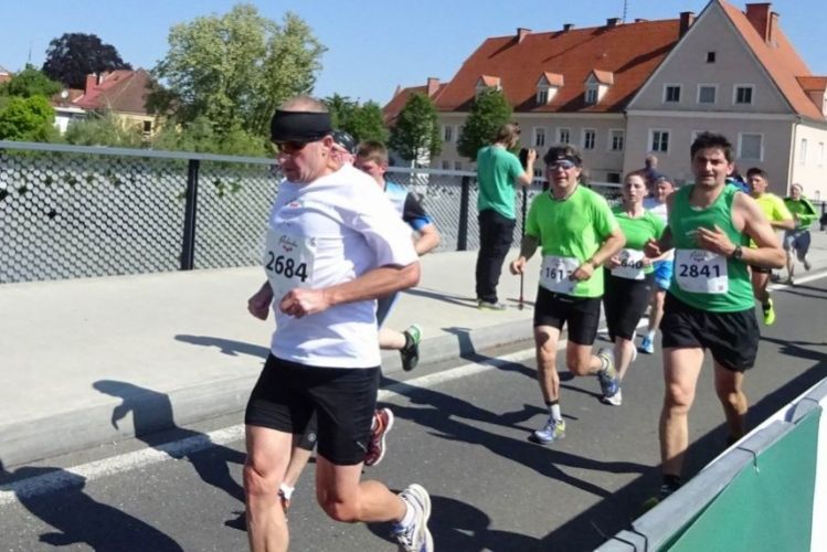 Es geht weiter in die slowenische Grenzstadt Gornja Radgona, ehemaliger Südteil von Bad Radkersburg, die ca. sieben Kilometer von Radenci entfernt ist. Wir laufen ein wenig in Zick-Zack-Manier durch den Ort, bevor wir den Grenzübergang erreichen und auf der Murbrücke hinüber ins steirische Bad Radkersburg gelangen. Fast die gesamte Laufstrecke bisher ist durch Pillonen zweigeteilt, hier auf der Brücke kommen uns nun die schnelleren Halbmarathonläufer entgegen, die nach ca. zehn Kilometern inklusive dem Durchlauf durch Bad Radkersburg, der uns noch bevorsteht, sich wieder auf den Rückweg machen. Die Trennstrecke hier auf der Brücke ist mit Werbung für das gesunde Mineralwasser förmlich zugedeckt. Ich frage mich, was die Aufschrift „Razdalje Premagujemo s Srcem“, die auch auf der Hinterseite des offiziellen Shirts aufgedruckt ist, exakt bedeutet.