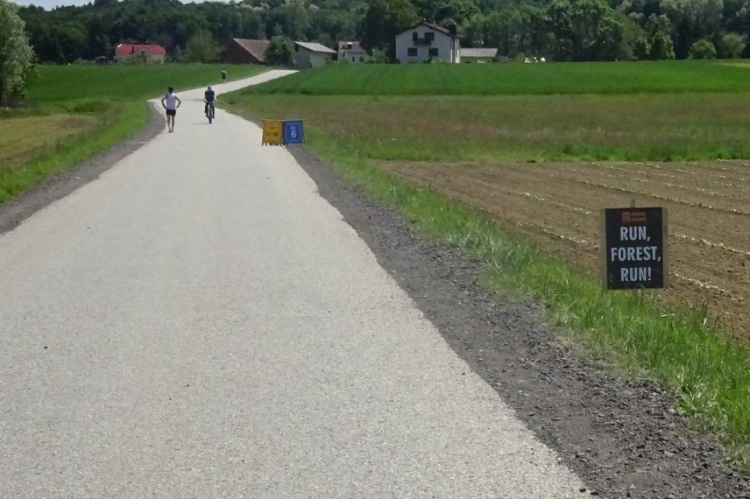 Der Marathonkurs führt weit außerhalb von Radenci auf einer asphaltierten Landstraße auf hügeligen Gelände weiter. Ein Läufer geht vor mir, die 38 km-Markierung befindet sich unweit einer ebenfalls auf einer Papptafel aufgedruckten message: „Run, Forrest, run“ lautet die Botschaft. Wer bei diesem Kilometerstand noch so laufen könnte, wie Forrest Gump alias Tom Hanks im Filmklassiker aus dem Jahre 1994, der hätte so viel Power, dass er diesen Marathon unter 4 Stunden finishen würde.