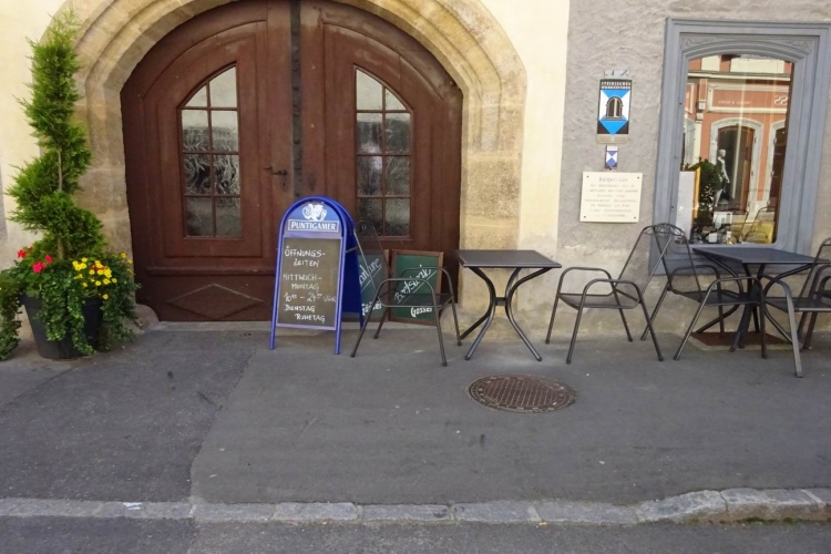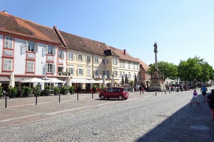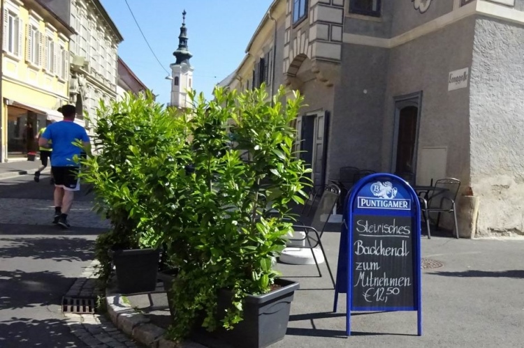 Auf der Langgasse knipse ich im Vorbeilaufen das Geschehen. Vor einem Gasthaus wird ein steirisches Backhendl zum Mitnehmen um 12,50 Euro angeboten. Der Preis wäre annehmbar, doch zum Verweilen könnte die Zeit zu knapp sein. Oder doch nicht? Der Marathon ist ja erstmals sechs Stunden offen, ein Essensstopp von 15 Minuten mit einem Gspritzten ginge sich eigentlich gut aus. Ich überlege ernstlich, aber nach bisher erst neun Kilometern erscheint mir ein Halt zu früh.
