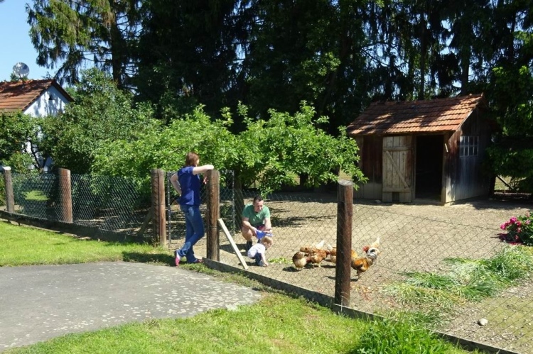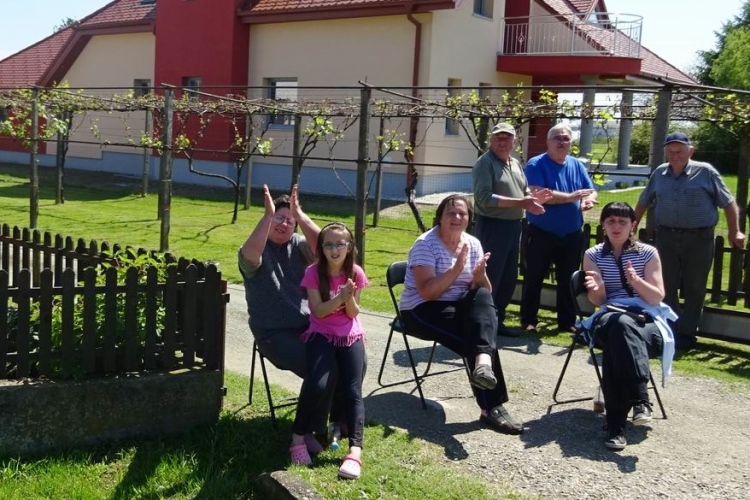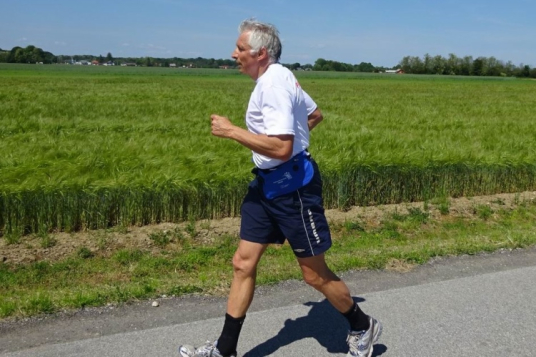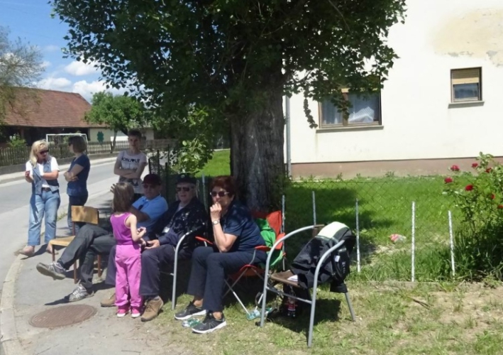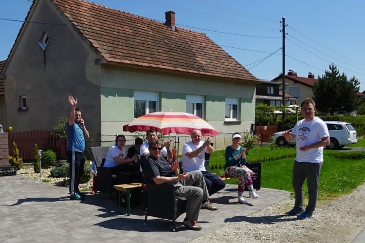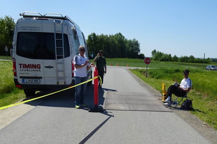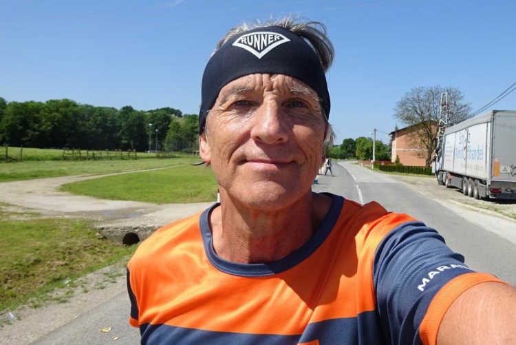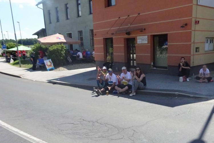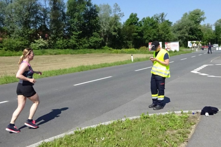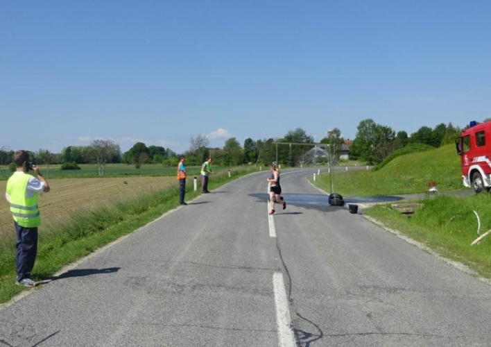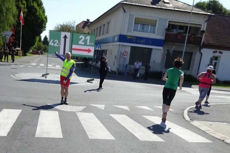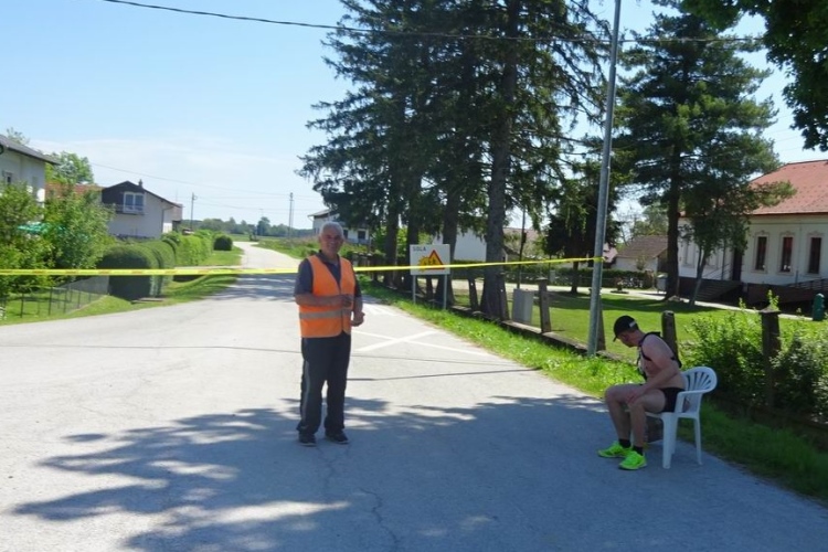 Der Kurs verläuft durch die Ortschaft Gederovci nach Westen. Nach einer 180 Grad-Wende in Richtung Cankova und dann zurück sowie einem Vorsprung von ca. 1 ½ Kilometern erblicke ich aus der Gegenrichtung kommend den etwas übergewichtigen Trailspezialisten mit Sonderausrüstung für den heutigen Straßenmarathon. Die Kamera in der Rechten haltend und mit der Halteschlaufe abgesichert, geht sich bei mir ein nach oben gestreckter Daumen als Gruß noch aus, den der Kollege sportlich fair erwidert. Ich versuche wieder etwas Tempo aufzunehmen, während ein vor mir liegender Läufer sich einfach auf den Sessel eines Ordners gesetzt hat und sich nun ausruht.