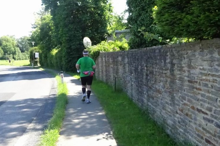 Bei Kilometer 21 sichte ich einen weiteren Läufer, der einen Trailrucksack am Rücken hat. Er hat sichtlich gut 10 kg zu viel Körpergewicht, warum er zusätzliche Kilos am Rücken mitschleppt, ist mir unklar. Im Vorbeitraben drehe ich mich gekonnt um und knipse ein Belegbild, das beide Hatscher, den auf den Spindelbeinen und den Beleibten, gut dokumentiert.