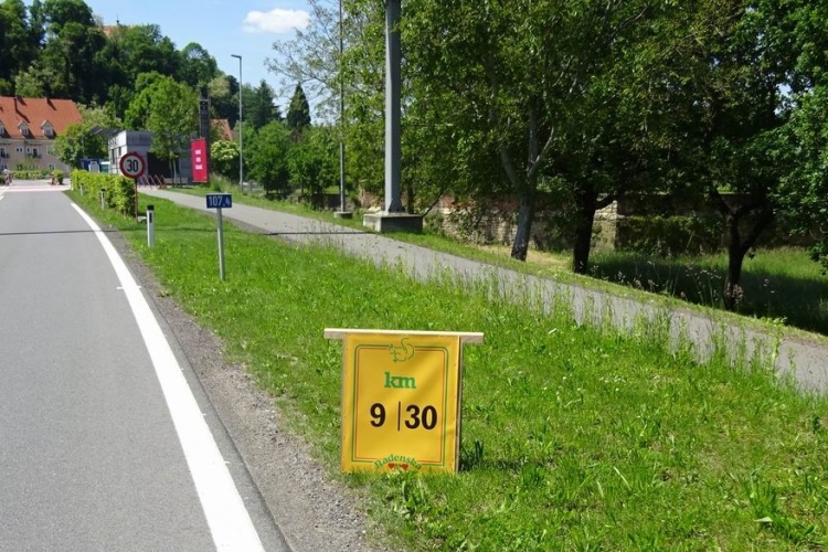 Am Ende des Ortes befindet sich die 14 km-Tafel. Heute kommt mir der Marathonkurs länger als sonst vor, vielleicht deshalb, weil ich fast nur alleine unterwegs bin. Bei einem Friedhof auf einer Anhöhe links der Wegstrecke folgt die 15 Kilometer-Markierung. Ich meide den dort aufgebauten Duschgang und versuche mich von der Kollegin zu lösen, die – als ich zurückblicke, sich unter dem Applaus zweier Streckenposten freiwillig nass macht. So heiß ist es heute um 10 Uhr 45 noch nicht, dass ich mich abkühlen muss, aber eine Strecke permanent in der Sonne strapaziert schon.