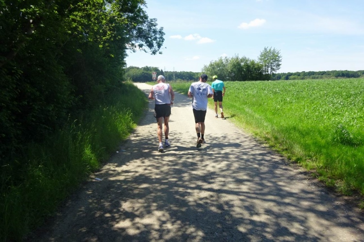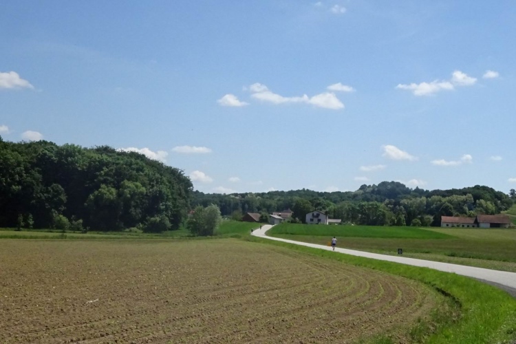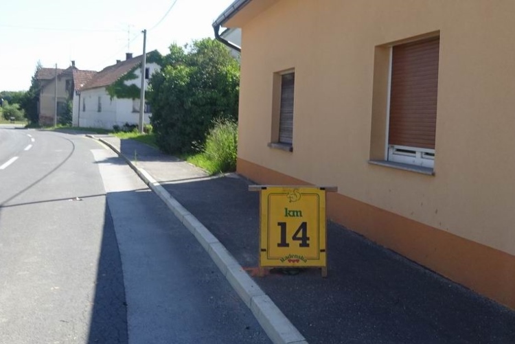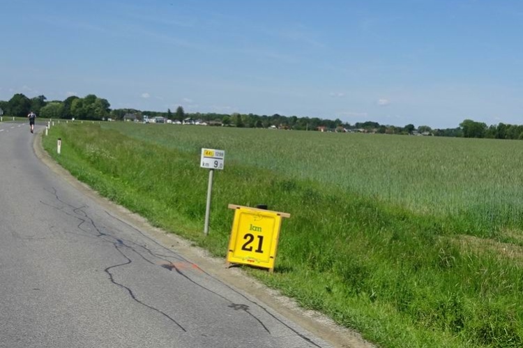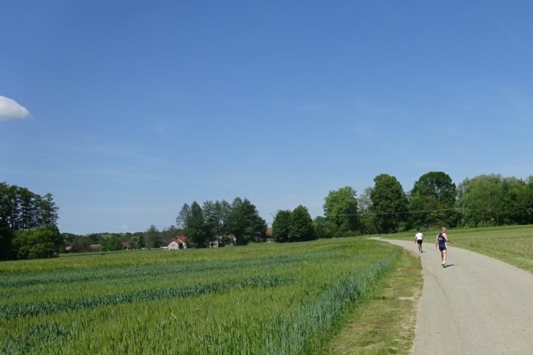 Die 10-km-Anzeige taucht auf, wir sind noch auf österreichischem Hoheitsgebiet. Ich nutze die ländliche Umgebung für einen kurzen Austritt. Die Läuferin setzt sich von mir ab. Bald darauf rücke ich auf einen langsameren Kollegen im grünen Shirt auf, den ich überhole. Noch ist die Kollegin gut 300 Meter vor mir. Beim 120-Seelen-Ort Zelting, zum Umland von Radkersburg gehörig, hole ich sie dann wieder ein und zudem eine andere Läuferin, die nur mehr marschiert. 13 Kilometer sind erreicht, meine Garmin zeigt 1:25 Stunden an. Im Vergleich zum Eco-Trail in Cervia letzten Sonntag bin ich heute sogar etwas langsamer unterwegs. Obwohl die Straße asphaltiert ist und die Strecke nach dem welligen Anfang nun flach ist.