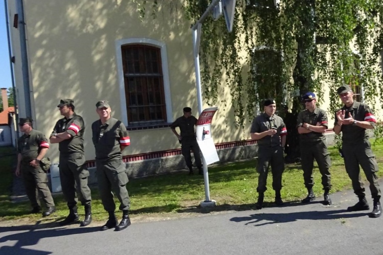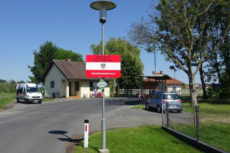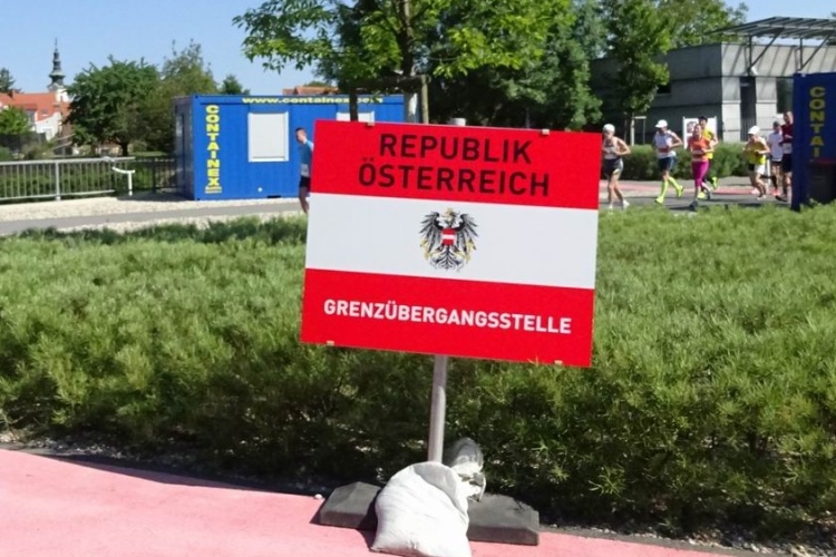Die österreichische Grenze liegt noch ca. einen Kilometer in westlicher Richtung vor mir. Ich blicke mich um, drei Verfolger, darunter die Kollegen, die bei Kilometer 23 einen Stopp eingelegt haben und der Typ, der eben den Sessel des Ordners zur Regeneration benutzt hat, sind in Sicht. Sie werden mich heute nicht mehr erwischen, weil ich noch Reserven habe. Nur zeigt die Garmin bei Kilometer 25,5 am Grenzübergang eine bisherige Laufzeit von 2:52 Stunden an. Es wird heute für mich sehr schwer, unter 5 Stunden zu finishen