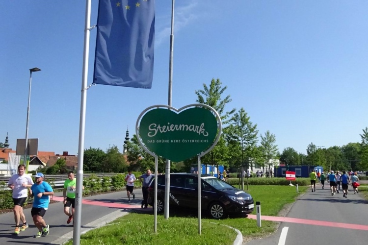 „Nasvidenje“ steht in weißen Lettern auf einer großen Tafel in grün – die Farbe der Slowenen. Es ist zu früh, nach 25 Kilometern schon auf Wiedersehen zu sagen, das hebe ich mir für das Finish auf. Auf der österreichischen Seite steht eine baugleiche Tafel mit der Aufschrift „dobrodošli“ – willkommen in Österreich. Ich bin wieder im grünen Herzen Österreich, der Steiermark. Der zweite Fahrstreifen beim Grenzübergang ist gesperrt, alle Autofahrer werden kontrolliert – sobald der Marathon schließt.
