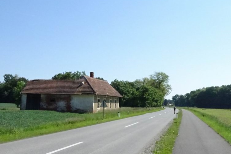 Auf der slowenischen Landstraße unter der Bezeichnung 440, die genauso wie alle bisherigen Streckenabschnitte total für den Verkehr gesperrt sind, geht es für mich im Stile von Forrest Gump einfach geradeaus weiter. Links und rechts sind grüne Wiesen, das Getreide wächst, es herrscht Stille. Die Kollegin ist nun endgültig zurückgefallen, ich warte auf mein nächstes Beutestück.
