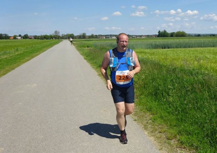 Bald darauf ist eine 180-Grad-Wende im Kurs vorgegeben, würde man diese nicht beachten, wäre man vom Ziel kaum mehr als zwei Kilometer entfernt. Ich sehe nun an der anderen Seite der Absperrung, wie einige Läufer entgegen kommen, die ich längst überholt habe. Zwei versuchen wieder näher an mich heranzukommen, doch bei der Labe nahe der 36 km-Anzeige verharren sie. Jetzt folgt ein Trailabschnitt auf Schotter durch den Wald, ich überhole einen weiteren Läufer.