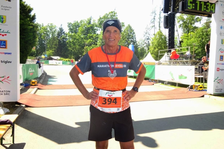 Man hängt mir eine Glasmedaille um, ein Belegfoto für mich macht einer der Ordner. Ich gehe zur Labestation im Ziel und nehme mir noch ein Isogetränk und Orangenstücke. Unweit daneben sitzt Werner im Gras und wartet auf mich. Er ist mit seinen heutigen 4:44 nicht so ganz zufrieden, kennt aber den Grund: Eine Zerrung im rechten hinteren Oberschenkel wurde beim Lauf wieder akut und hat ihn behindert. Wir nehmen die vom slowenischen Militär bereitgestellten Duschfahrzeuge in Anspruch. Das Wasser ist herrlich warm, man fühlt sich gleich wieder wie recycelt. Bei einem anschließenden Bier lassen wir den Lauf nochmals Revue passieren.