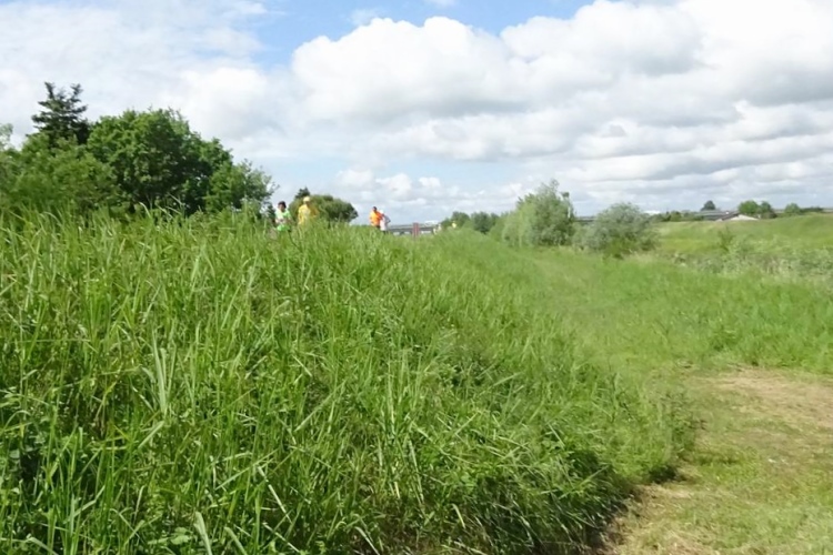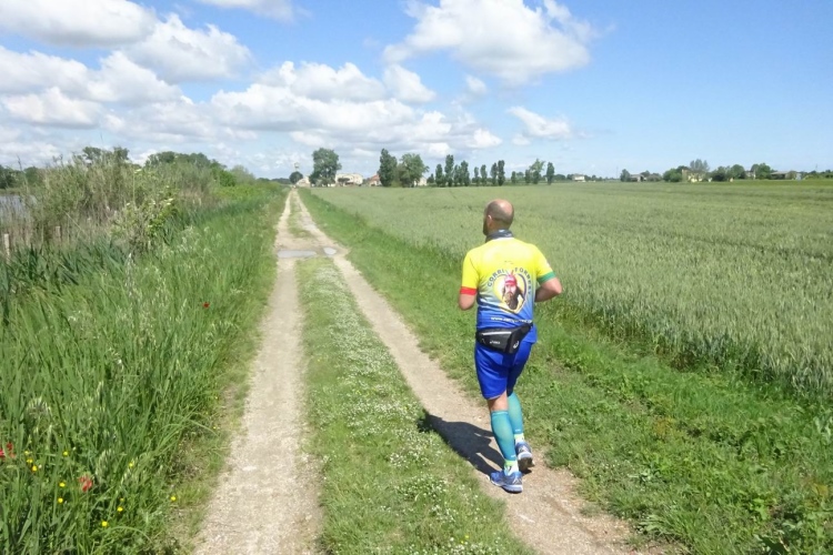 So schön hier die Landschaft ist, so wenig komme ich mit dem Untergrund zurecht. Die Feldwege sind so uneben, dass man sich nicht richtig abstoßen kann, was zum Um und Auf des Laufens gehört. Zu unserer Linken ist der Savio, dessen Flusslauf hier durch Sträucher und Laufbäume verdeckt ist. Wir laufen tlw. eigentlich auf einen mehrere Meter hohen Erdwall, der als Damm fungiert und der an den Böschungen von allerlei Pflanzen überwuchert ist. Natur pur, könnte man anmerken, so steht es auch in der Fremdenverkehrswerbung der Emilia Romagna. Knapp vor der nächsten Labestelle bei der Ponte di Lido di Savio kommen uns einige Teams der Bike- und Laufgruppe entgegen. Ein kleiner Bub fährt auf dem Kinderrad voraus, der dickliche Papa schwitzt und geht hinten gemächlich nach. Ich rechne mir aus, dass ich wohl noch 1 ½ Stunden brauchen werde, um nach der noch bevorstehenden Schleife von gut 10 Kilometern hier nahe der via Argine destro Savio nach links wie eben die Bike & Run-Teams abbiegen zu können.