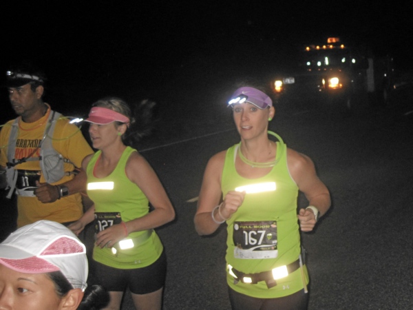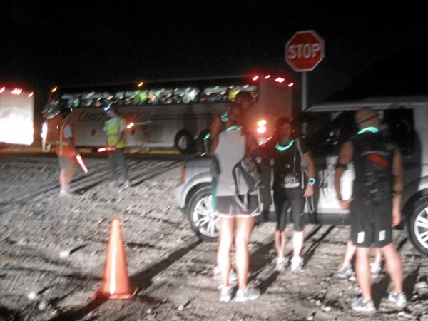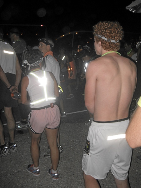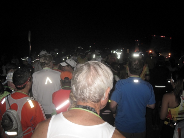 Irgendwann wurde mir bewusst, dass hier nicht nur Marathon- und Ultraläufer standen. Auch die Halbmarathonis und 10-km-Läufer, die mit den Bussen gekommen waren, tummelten sich hier. Sie würden uns um Mitternacht auf unseren langen Weg verabschieden und dann mit den Bussen weiter zu ihrem jeweiligen Startbereich fahren: Die Halbmarathonis starteten eine halbe Stunde später sieben Meilen (11 km) weiter und die 10-km-Teilnehmer eine Stunde und 20 Meilen (32 km) weiter.