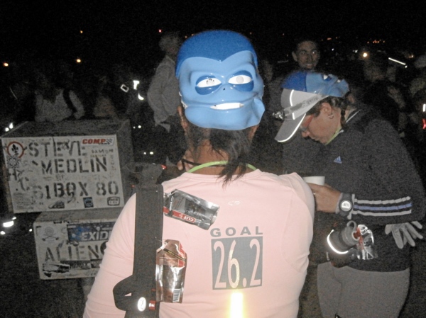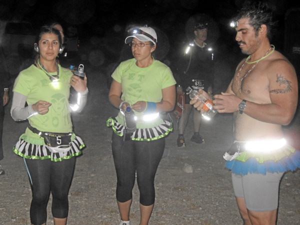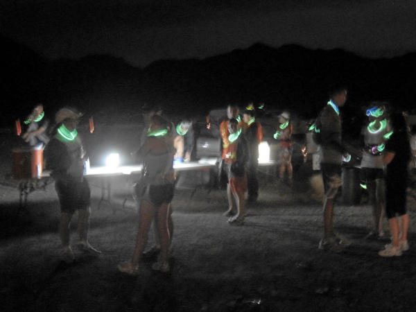 Noch aber dominierten die bunt leuchtenden Läuferinnen und Läufer um uns herum. Bei diesem Lauf ist es Tradition, dass man sich dem Motto „Alien“ entsprechend kleidet und viele sind dem nachgekommen und haben sich mehr oder weniger phantasievoll geschmückt. Es war schon eine eigentümliche Atmosphäre hier in der einsamen Wüste. Ein bunter, leuchtender Haufen, alles redete erwartungsfroh durcheinander, gedämpfte Musik kam aus der Lautsprecheranlage, nicht dröhnend laut wie so oft bei unseren Läufen in Europa und ab und an informierte der Sprecher über den weiteren Ablauf.