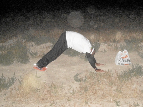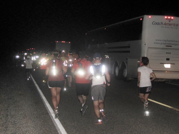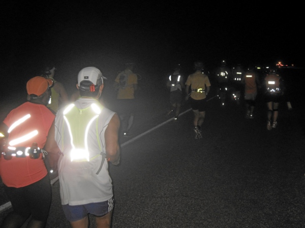 Auf den ersten 10 oder 11 Meilen verlief die Straße kerzengerade, beidseitig begrenzt durch einen weißen Randstreifen, noch ein paar Zentimeter Asphalt und dann Schotter. Auflage war, dass man links vom Randstreifen laufen sollte. Als Grund wurde angegeben, dass das eine öffentliche Straße sei, auf der auch Verkehr wäre. Nun, kein Mensch hielt sich daran! Warum auch? Es war Mitternacht, eine Straße im Nirgendwo mitten in der Wüste, wer sollte da auch schon fahren. In der Tat kamen während des ganzen Laufes keine 10 Fahrzeuge an uns vorbei und vermutlich waren die meisten davon auch noch Angehörige.