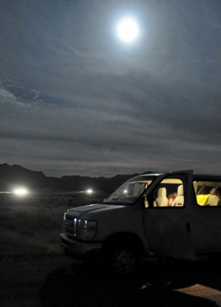 Die Temperatur lag wie erwartet bei etwa 23 Grad, immer noch waren Wolken am Himmel, zunehmend aber schaute der Mond heraus und bald hatte der warme Wind alle Wolken vertrieben und der helle Vollmond tauchte die Umgebung in ein feines Licht - die passende Alien-Stimmung.