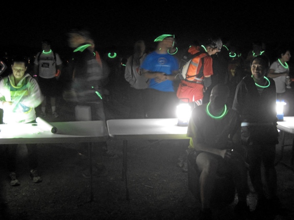 Es war kurz vor 22 Uhr, in zwei Stunden erst war Start. Ein paar wenige „leuchtende“ Teilnehmer aber waren schon da. Leuchten taten natürlich nicht die Läufer, sondern der Ring, den sie um den Hals trugen. Jeder Teilnehmer des Laufes bekam im Startbereich einen grün leuchtenden Stab, den man um den Hals trug. Wir zogen uns um und gesellten uns ebenfalls zu den erleuchteten Gestalten.