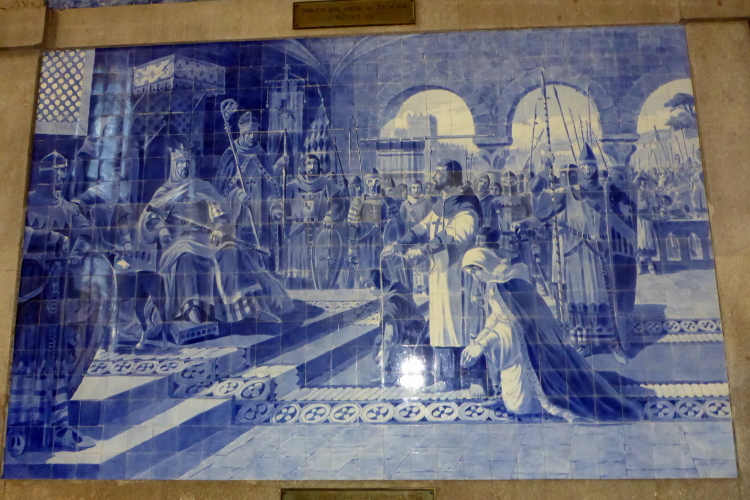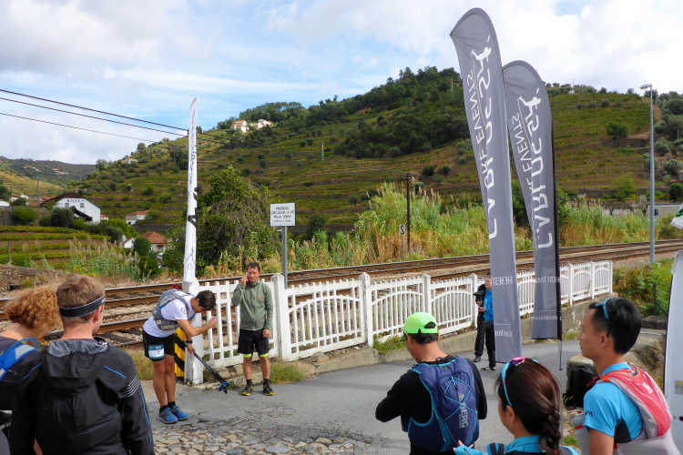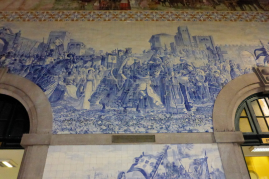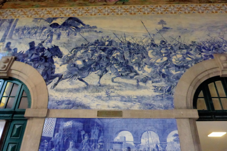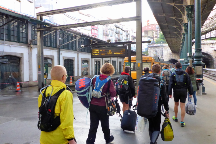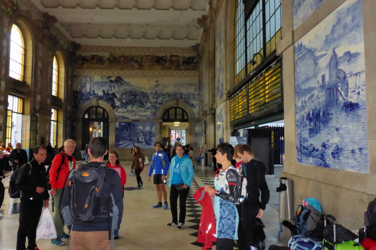 Treffpunkt der Truppe am Sao Bento Bahnhof, berühmt wegen seiner Azulejo, den blau bemalten, glasierten Keramikfliesen im Inneren. Hervorstechend ist das Mosaik, das Heinrich den Seefahrer 1415 bei der Eroberung Ceutas zeigt. Ein Lieblingsthema von mir, doch wir müssen schnell zum Zug. Fahrscheine und Startnummern werden im Zug verteilt. Jeder Läufer erhält auch noch einen Tracker, niemand soll in der Wildnis Portugals verloren gehen.