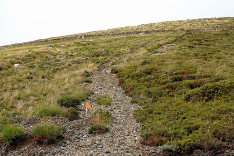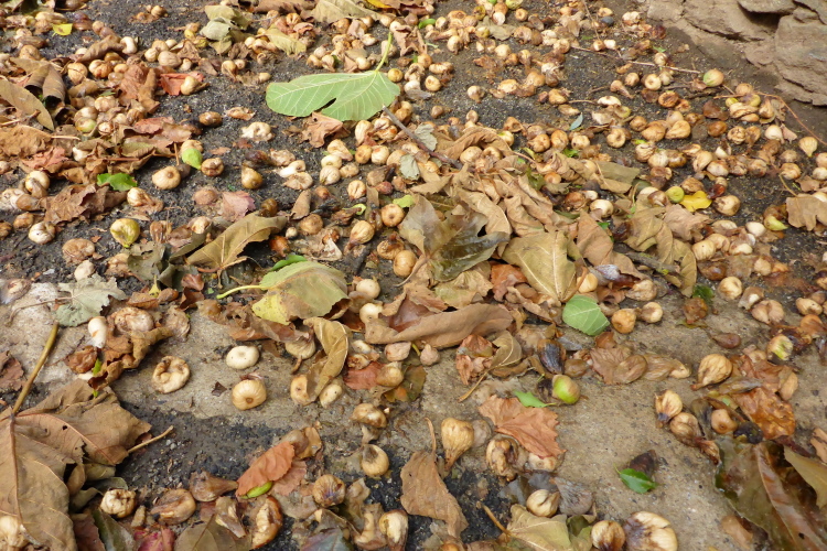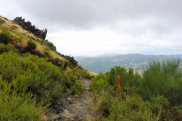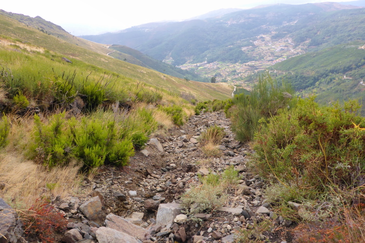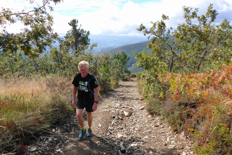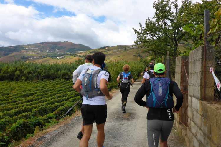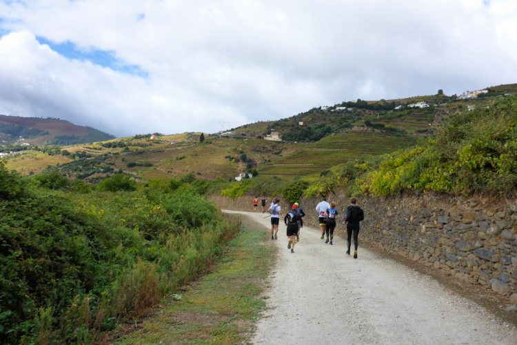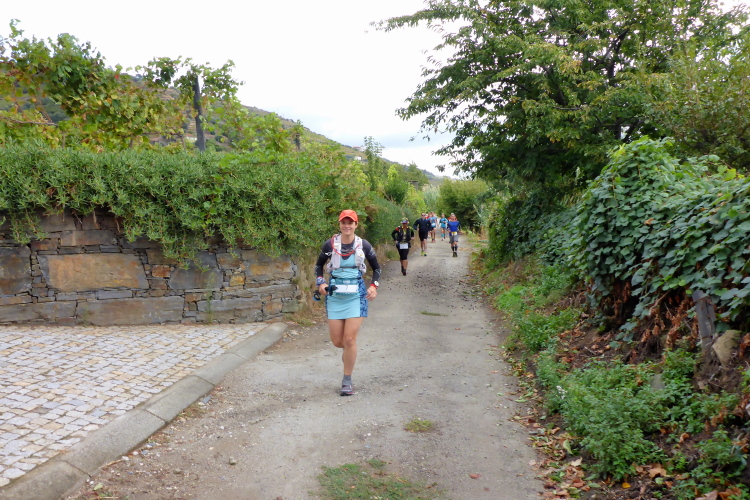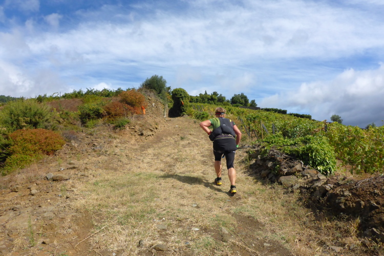 Es gibt zwar Wirtschaftswege, die in Serpentinen hinauf führen, doch die mag Carlos Sá nicht. Er nimmt die direkten Wege. Es sind alte, raue Wege, die mit hohen Mauern eingefasst sind. Die parallel zum Hang gezogenen Trockenmauern stützen die Weinterrassen, die aufwärts führenden Mauern sind Lagerort für Steine, die man im Weinberg nicht braucht. Hier rauschen die seltenen Regenfälle hinab und hinterlassen einen schwierigen Trailuntergrund, der zentimeterdick mit Feigen bedeckt ist.