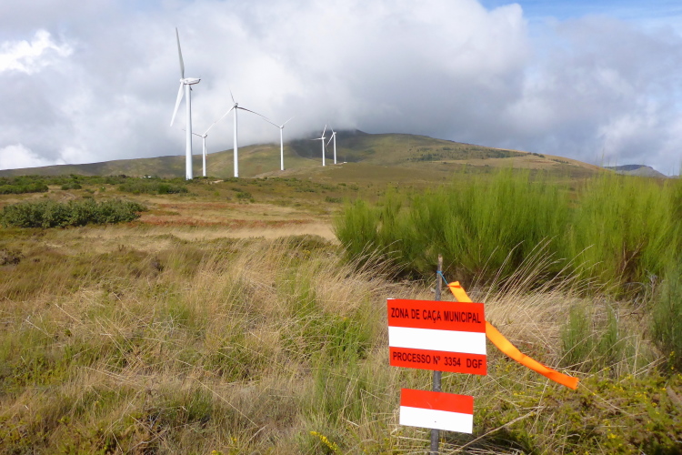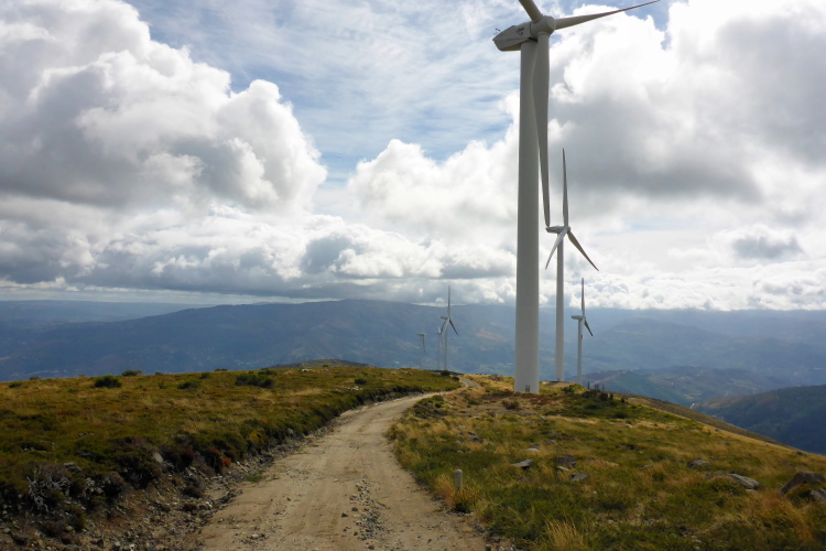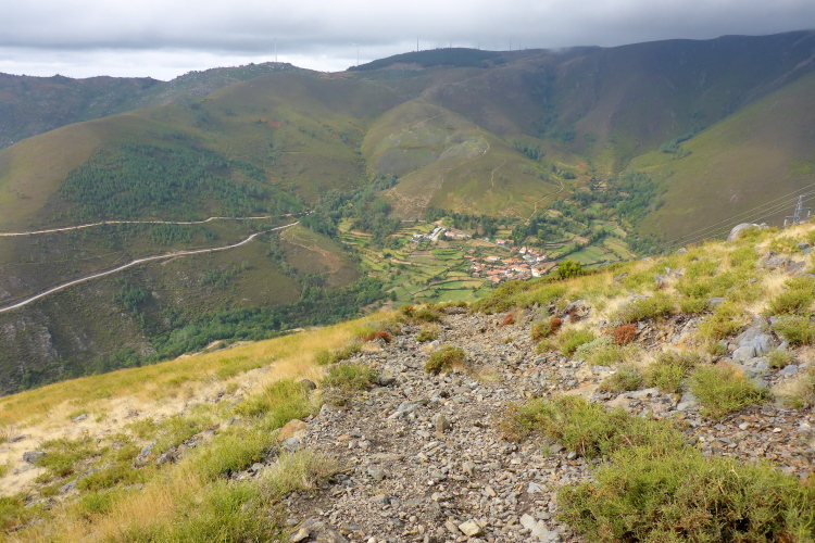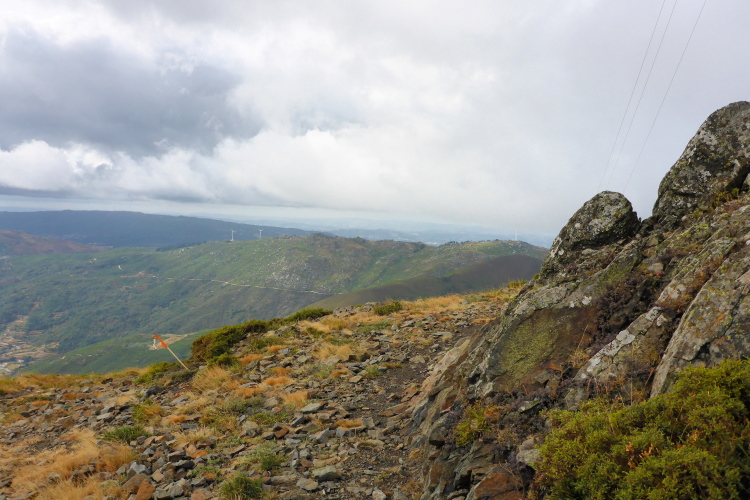 Die rotweißen Schilder am Wegrand „ Zona de Caca Municipal“ bedeuten nicht, dass hier die das Gemeindeklo eingerichtet wurde. Caca heißt Jagd, es gibt hier also keine Jagdpächter, das Jagdgebiet gehört der Gemeinde. Wem die schrecklichen Windräder im Nebel gehören weiß ich nicht, sonst würde ich mich über das grausame Quitschen beklagen. Der kalte Wind ist so stark, dass sich die Mühlen ständig aus dem Wind drehen müssen. Zwischen den mythischen Granitfelsen laufend ist das ein unpassendes Geräusch.