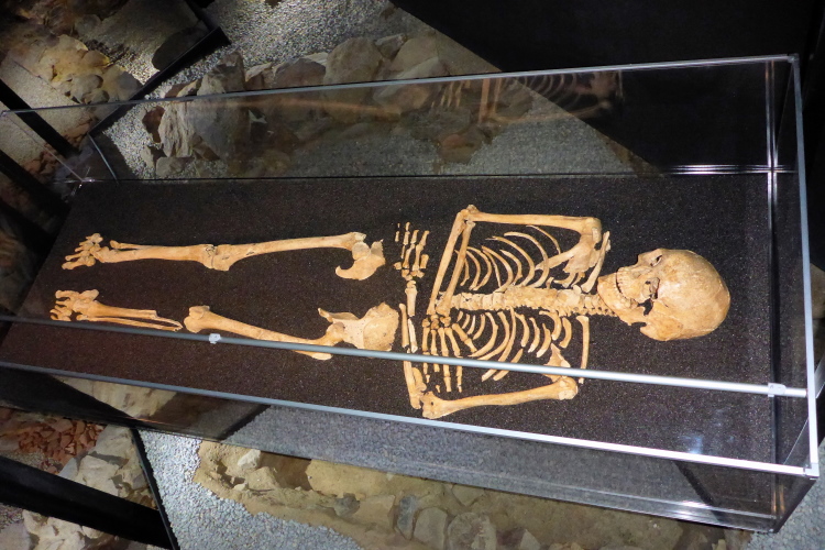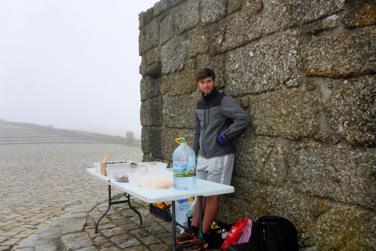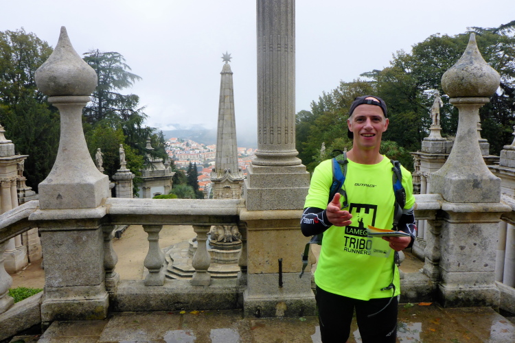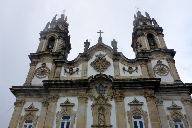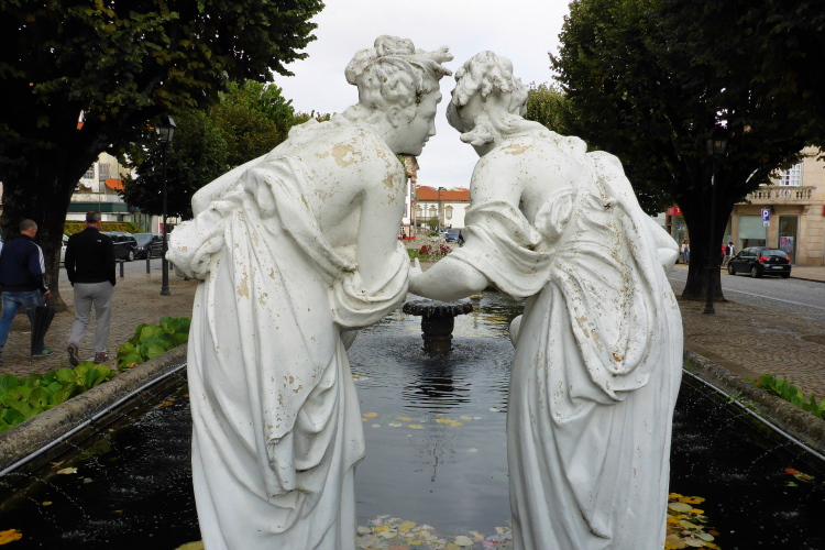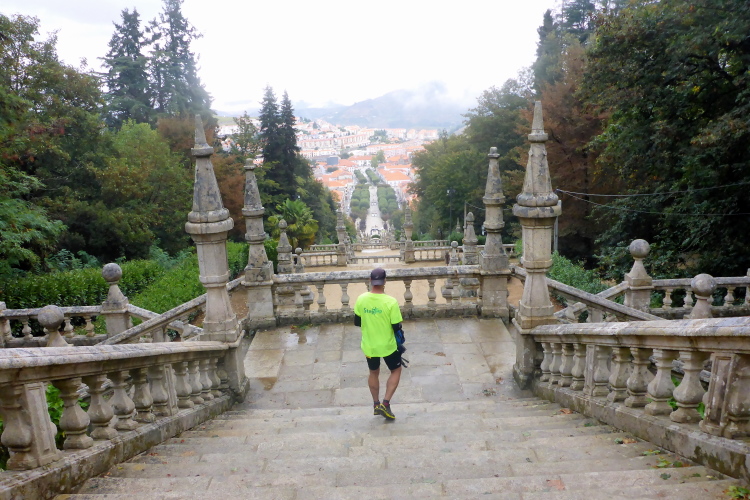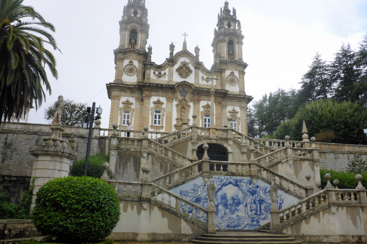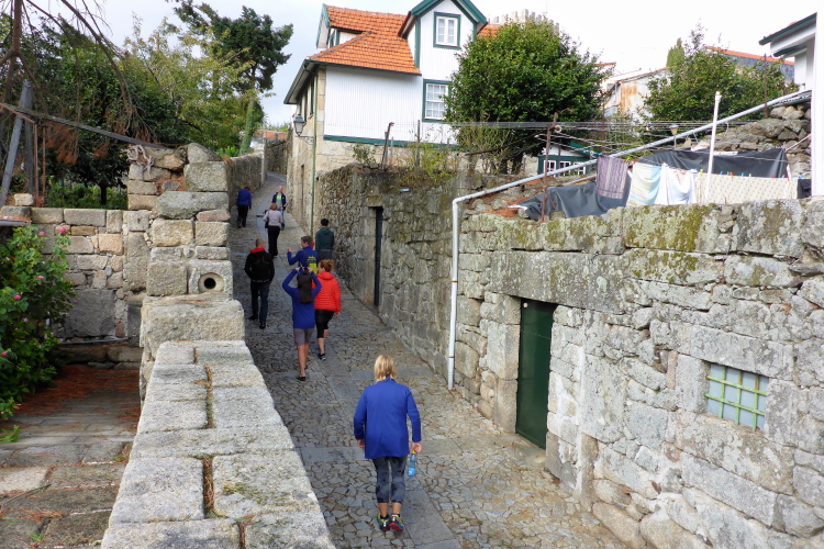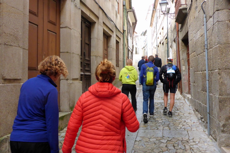 Endlich komme ich zur Kirche Nossa Senhora dos Remédios. Das Rokokogebäude von 1761 befindet sich auf einer Anhöhe über der Stadt. 613 Stufen laufen wir die Doppeltreppe hinunter zur Hauptstraße von Lamengo, wo der Zielbogen steht. Geduscht wird im Gemeindeschwimmbad, dann geht es zum Mittagessen in die Taverna. Anschließend wieder Kultur: Wir wandern zur Burg, wo der erste König von Portugal, Alfons I. (Portugiesisch: D. Afonso Henriques) 1143 durch die Versammlung der Cortes (Stände) gewählt wurde. Die Burg steht auf einer keltiberischen Burg. 587 verkündete hier der König des Westgotenreichs, Rekkared I., dass er zum Christentum übertritt. In Folge dessen wurde die iberische Halbinsel christlich. Interessant sind die Ausgrabungen in der Burg: Über der römischen Anlage liegen christliche Gräber aus dieser Zeit. Irgendjemand hat in den Wirren der damaligen Zeit in der Mauer einen Schatz, bestehend aus 600 Münzen vergraben. Sein Geheimnis hat er mit in den Tod genommen.