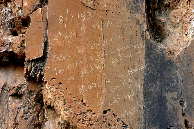 Die letzten Kilometer geht es steil hinauf durch urwaldartige Landschaft, dann an der prähistorischen Kunstgalerie entlang. Ich entdecke zunächst nur eine Ritzung von 1993, dann ganz unscheinbare aus Urzeiten. Als ich wieder mal nach oben schaue, verliere ich das Gleichgewicht, stürze von einem Felsvorsprung. Kaum vorstellbar, dass hier einst Menschen barfuß gelaufen sind.