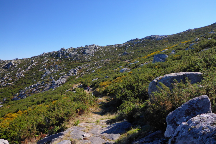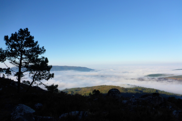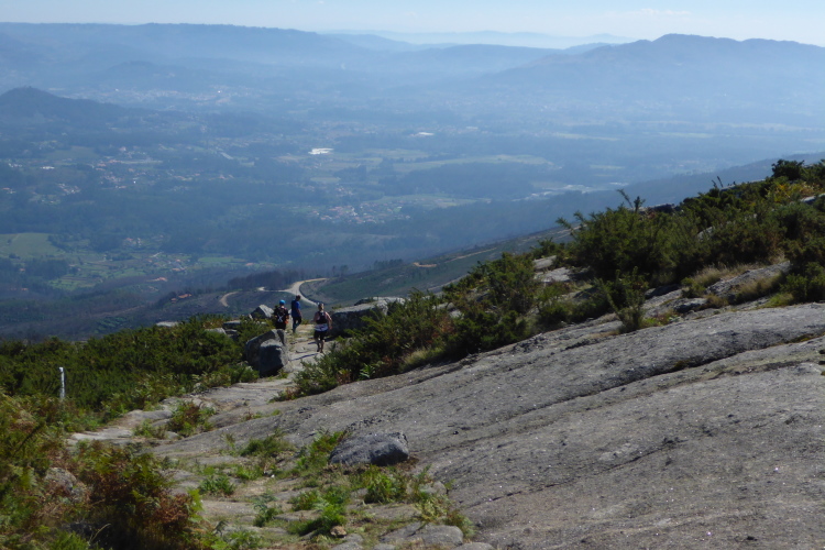 Im Rucksack finde ich zwei alte Müsliriegel, man wird mit der Zeit nachlässig und packt den Rucksack nicht mehr ordentlich. Die Riegel schmecken nach Schweiss. Unter mir liegt Arte na Leira, gerade wird die Sonntagsmesse abgehalten, die mit Lautsprechern in das Tal übertragen wird, damit auch diejenigen, die nicht mehr laufen können, an der Messe teilhaben können: Gloria in Excelsis Deo. Ehre sei dem da oben, der nicht mehr kann, trotz Deo. Ich muss aufstehen, sonst verbrenne ich.