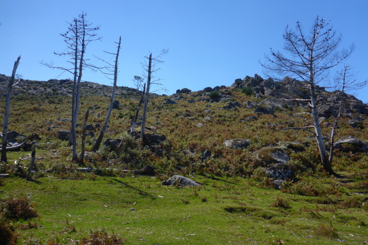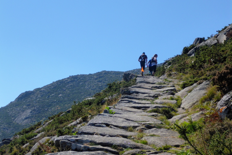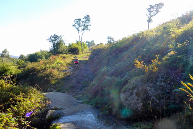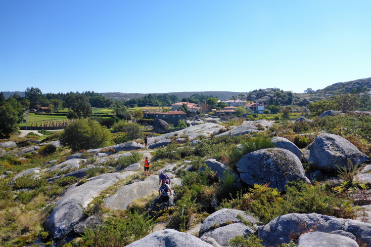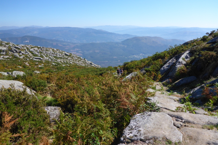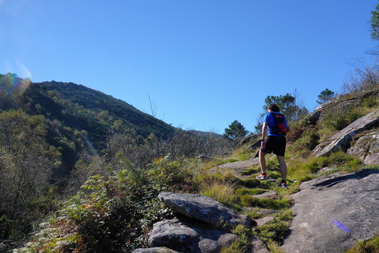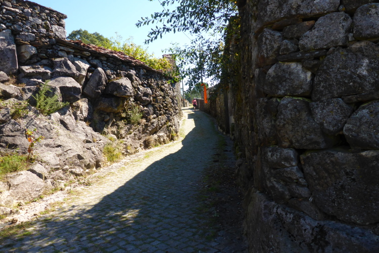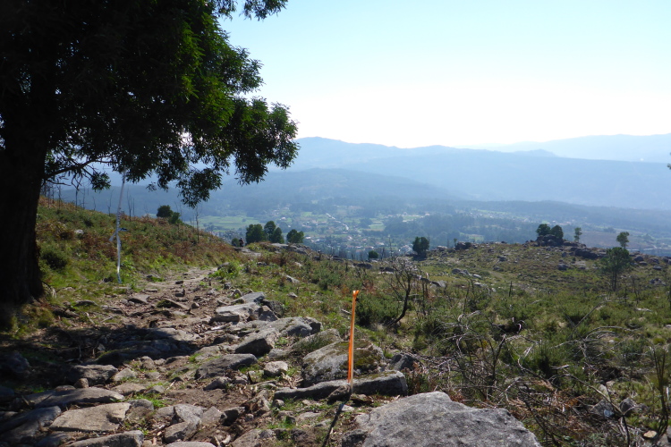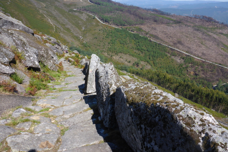 Es geht nun an der Innenseite der Serra wieder hinauf, zunächst an einem lieblichen Bachlauf entlang, dann sogar durch dichten Tannenwald, dass ich glaube, wieder im Pfälzer Wald zu sein. In Mostreiro, bei km 12, gibt es eine frische Quelle. Jeder kippt sich das eiskalte Wasser über den Kopf, die Sonne hier ist mörderisch. Das Hinablaufen erfordert viel Kraft, es ist schwierig die Steine zu treffen, oft knickt der Fuss ab, Knie, Hüfte, Rücken mosern gewaltig.