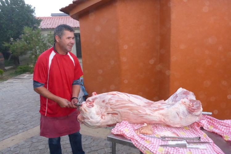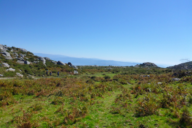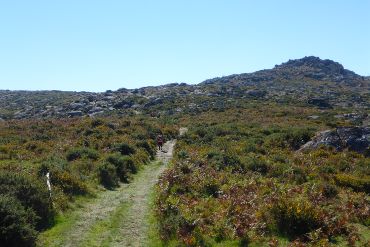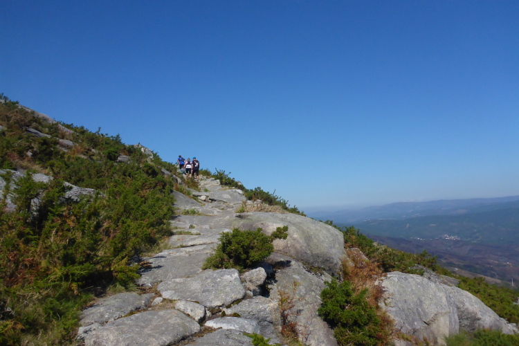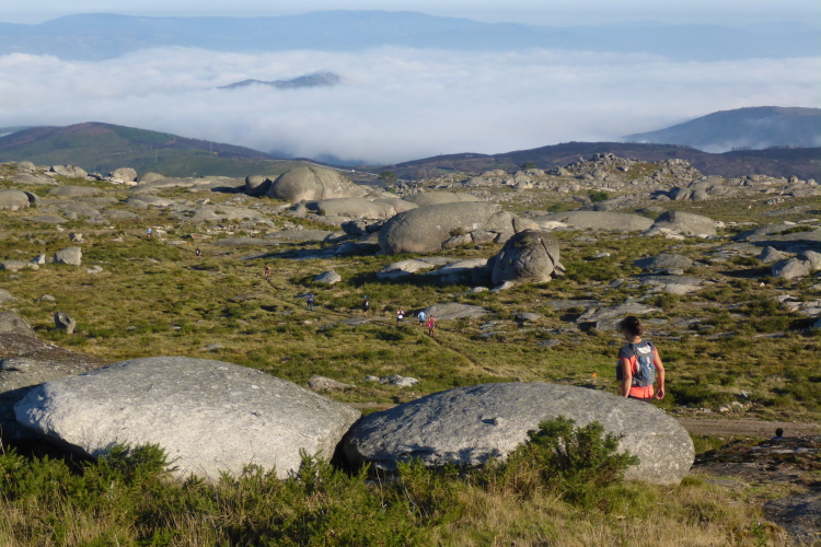 Nebenan ist die Kirche Srª do Minho, die Messe hat noch nicht begonnen. Die Lautsprecher übertragen Gesänge über die Hochebene, das hat was Mystisches, das ist bewegend in der Einsamkeit der Gluthitze hier oben. Santiago-Pilger laufen im Kreis um die Kirche, in der Hand den Rosenkranz. Sie werden hier oben übernachten und morgen den Jakobsweg weiterlaufen, 200 km sind es noch.