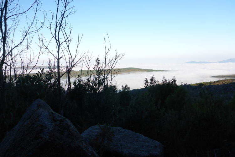 Es geht eine Ehrenrunde durch das Dorf, nicht ohne, ich ja auch nicht. Nach einer Stunde sind wir oberhalb des Nebels, der sich anscheindend über dem gesamten Atlantik ausbreitet. Die Serra d´Arga ist wie ein großer Vulkan geformt. Wir werden heute an den Flanken hoch und runter laufen, durch die fruchtbare Hochebene (deswegen der Name: „ Agrar-Hochfläche), so kommen 3300 Hm zusammen. Die Ausschreibung erzählt von 6000 plus minus, ich dachte nicht, dass minus orthopädisch so relevant sein kann.