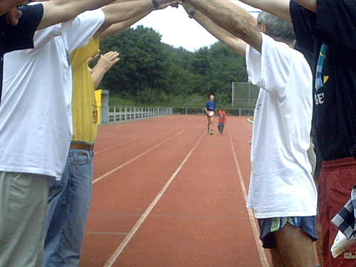 Kurz vor 9:00 Uhr stellten wir uns auf zum Start. Horst (zusammen mit Tochter Beate und Patenkind) hielt eine sehr emotionale Ansprache und wies auf die Leiden in dem kleinen Dorf Twimia/Koase hin. Dann gings im wahrsten Sinnen des Wortes rund: 106 Runden waren auf der Kunststoffbahn zu absolvieren. Ehrensache, dass Horst selbst auch mit lief.