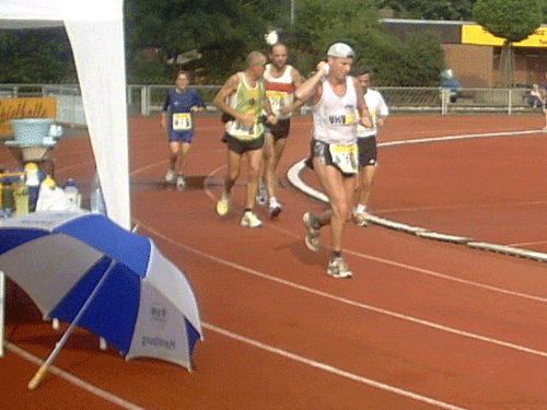 Die Sonne brannte vom Himmel, es war schwül und mir kam es vor, als ob die Kunststoffbahn von unten wärmte. Kein ideales Marathonwetter, aber mir war es so lieber, als zu kalt. Kerstin konnte nun gut beobachten, wie sich die Schritte und die Mimik der Läufer nach einiger Zeit veränderten. Ab und zu steuerte ich meinen eigenen Verpflegungskorb an, obwohl für alles bestens gesorgt war. Langweilig war das Rundenlaufen nicht. Während ich überholte oder überholt wurde, gab’s immer ein Gespräch.