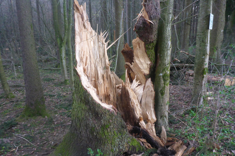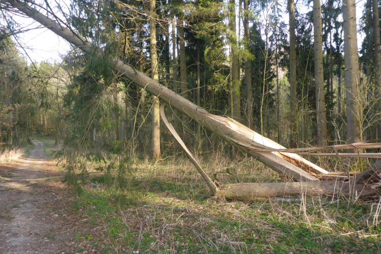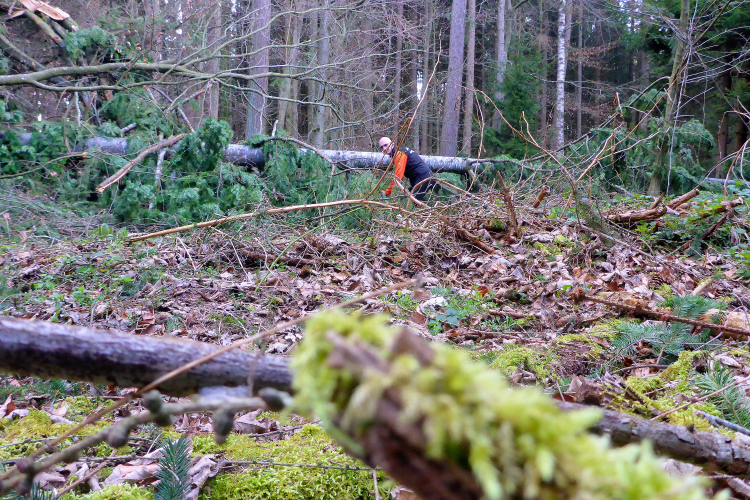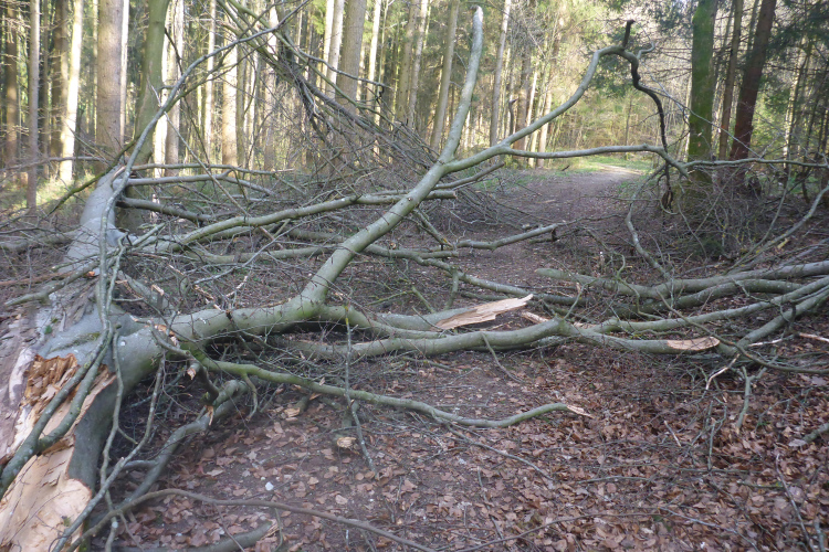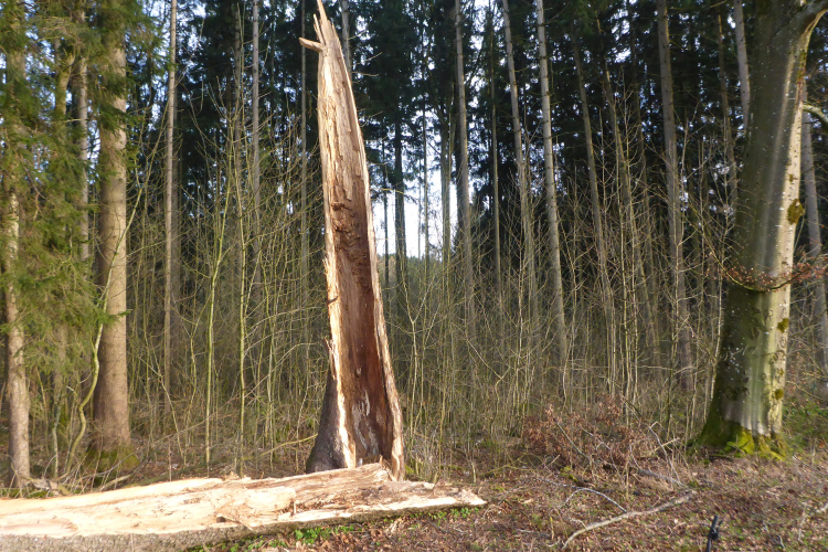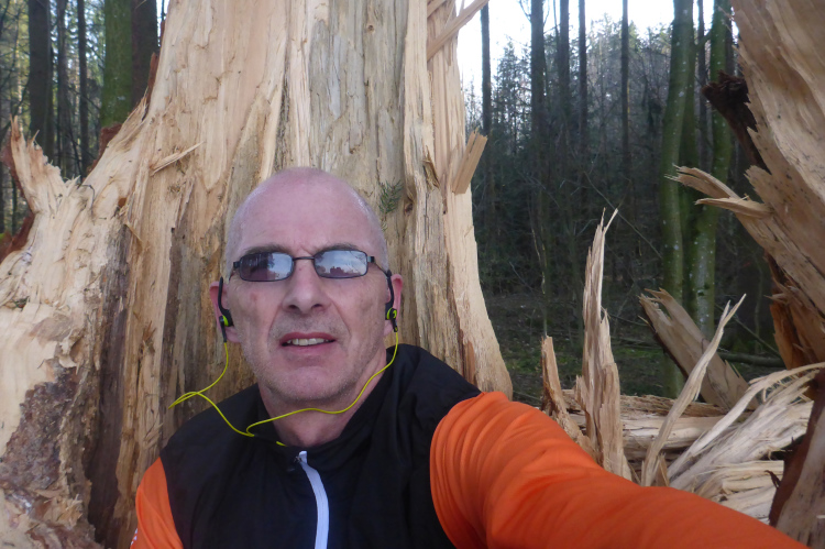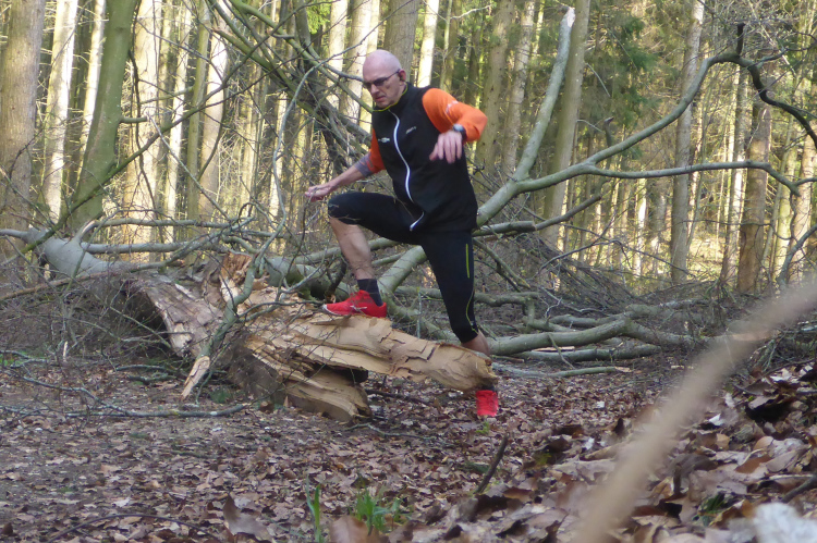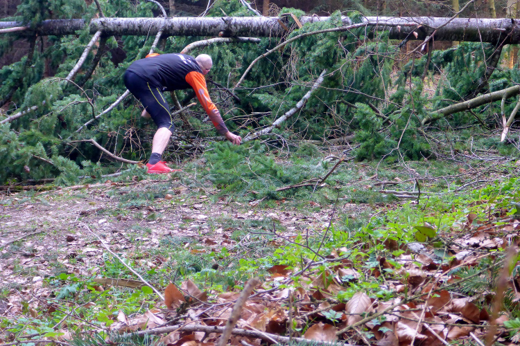 Nach den ersten Anstiegen bin ich mitten im Wald. Gewaltige Sturmschäden durch Sabine, Ute, Victoria und wie die Sturmtiefs alle hießen, die beinahe in Tagesabständen im Januar und Februar über unser Land zogen, werden mir erst heute so richtig vor Augen geführt. Aber man kann dem ganzen natürlich auch etwas Positives abgewinnen, denn im Prinzip ist hier ein riesiger Abenteuer-Spielplatz für Trailrunner entstanden. Riesige Fichten liegen gefällt über meinen Trails, die diverse Klettereinheiten erfordern. Teils sind fast abstrakte Kunstwerke aus den Resten der noch stehenden Stämme entstanden. Schön anzusehen, aber natürlich auch traurig.