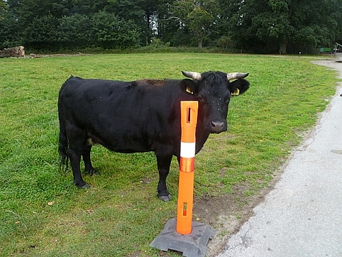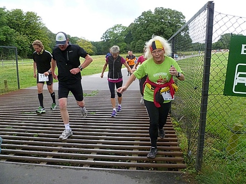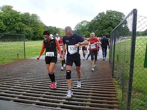 Nachdem wir den in der ersten Runde noch unbemannten Wasserpunkt etwa bei Kilometer 3,5 passiert hatten, waren wir dann doch etwas irritiert, als uns die Streckenhinweise direkt zum Tigerwald, genauer: zur PKW-Zufahrt in selbigen, wiesen. Allerdings liefen wir dann doch nur wenige Meter neben diesem Hochsicherheitstrakt vorbei. Kurz vor Kilometer 6 hätten wir nach rechts ins Nachbargehege zu Zebras, Gnus, Straußen und anderen abbiegen können, doch führte die Strecke hier stattdessen nach links, vorbei an einem idyllischen Steinhaus, durch ein Wäldchen und von dort etwa einen Kilometer Pendelweg zum Start/Ziel zurück, wo wir zunächst noch eine kleine dreieckige Wendeschleife vorbei am Verpflegungspunkt vor uns hatten, ehe wir Runde 2 in Angriff nehmen konnten.
