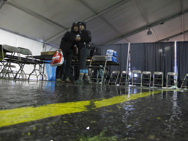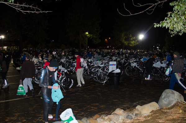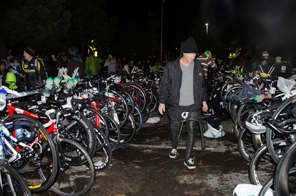 Kalifornien heißt nicht automatisch Sommer, Sonne, Sonnenschein: Es hört nicht auf zu regnen. Die schwarze Wand hat sich langsam erst über den See und dann über den ganzen Himmel verteilt. Die Räder triefen vor Nässe, die Laufbeutel liegen in den Pfützen und die Stimmung ist alles andere als auf einen IRONMAN eingestellt. Was ich mich nun schon den ganzen Tag frage: Was und wie viele Lagen Kleidung ziehe ich morgen an und was mache ich, wenn es ein paar Stunden später erst wieder warm aber mit dem Einbruch der Dunkelheit wieder kalt wird?