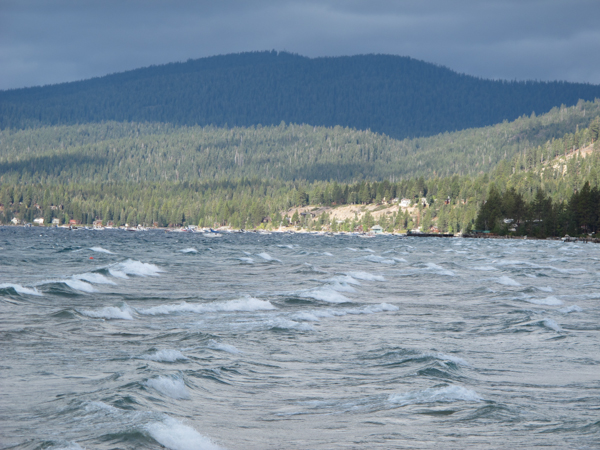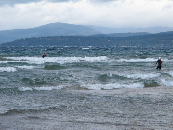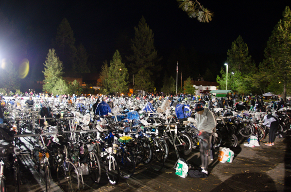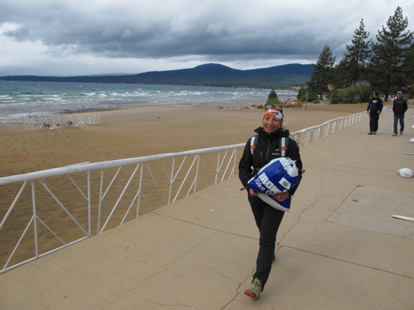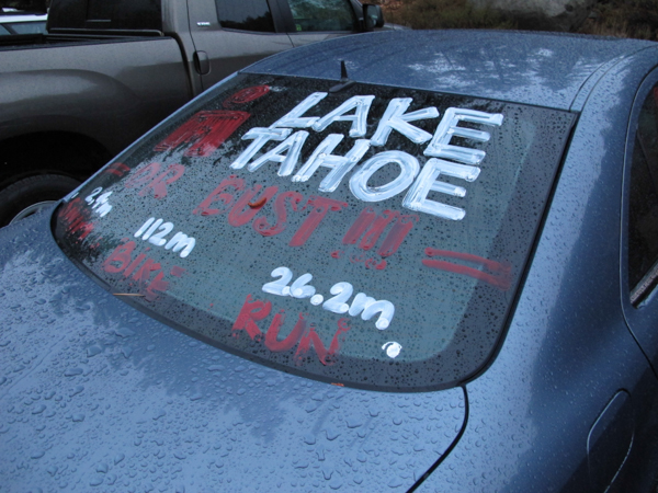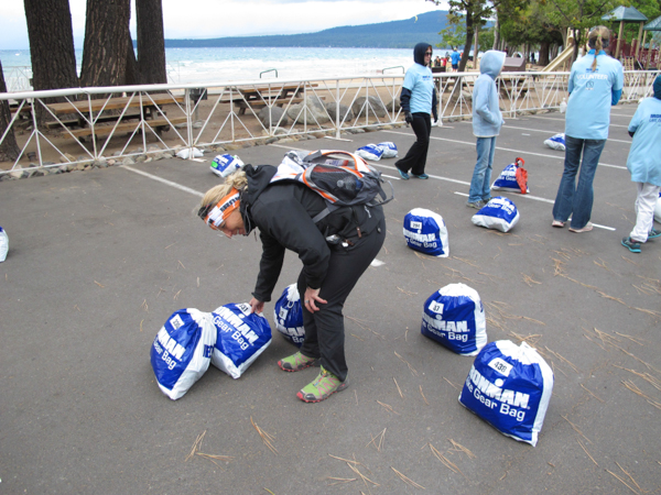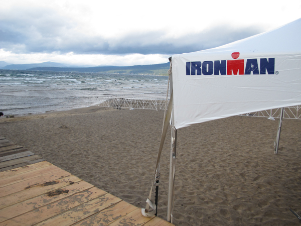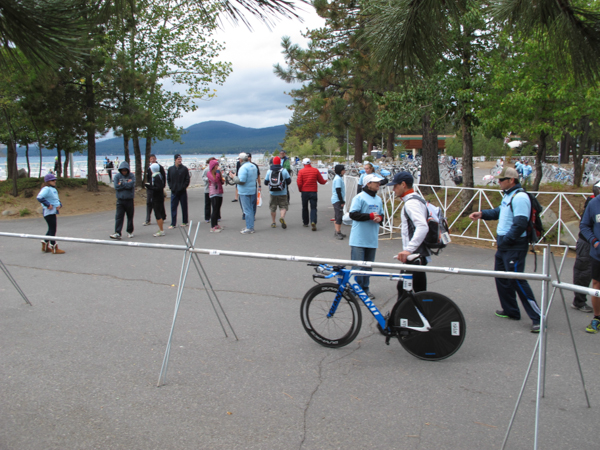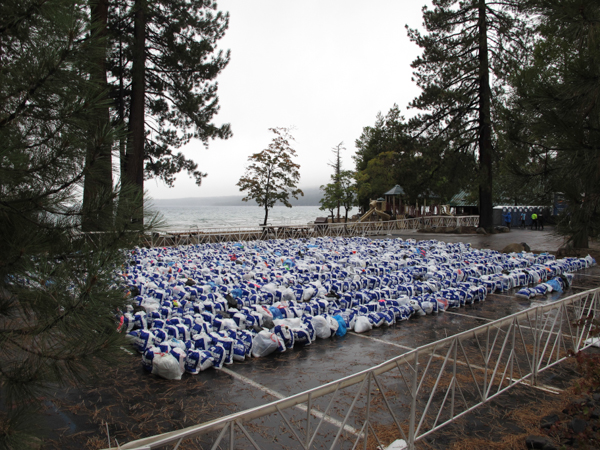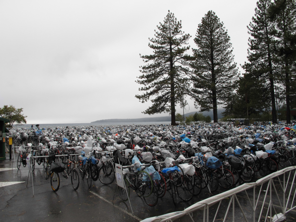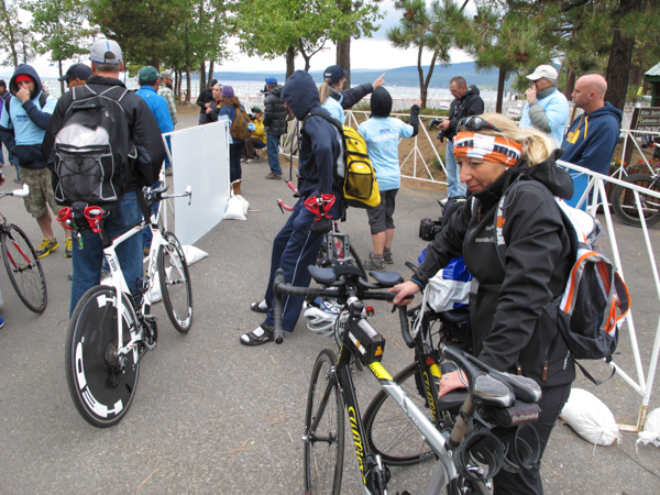 Der Lake Tahoe ist ein saphirblauer Gebirgssee und die Gebirgsketten der Sierra Nevada zählen zu den schönsten Ausflugszielen Kalifoniens. Hier am Nordufer des Sees spielt niemand um sein Glück. Wer hier wohnt, hat es längst gemacht. Hier oben ist alles anders, vornehmer, zurückhaltender, geschichtsträchtiger. Beim Rad-Check-In am Samstag beginnt das übliche Schaulaufen der durchtrainierten Athleten. Jedoch sieht man statt gebräunter Beine in knappen Shorts und verspiegelter Sonnenbrille im Haar fast jeden in langen Hosen, Regenjacken und Wollmützen. Galt bis vorgestern noch die Feuerwarnstufe hoch, so hat sich das über Nacht mit einem kräftigen Sturm schlagartig geändert. Es pfeift der Wind durch die Pinienwälder am Ufer, in der eisigen Brise auf dem Lake Tahoe fegt ein Kite-Surfer über die wilden Wellen.