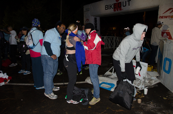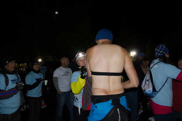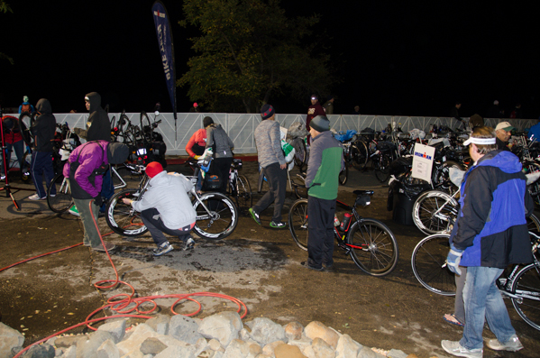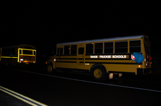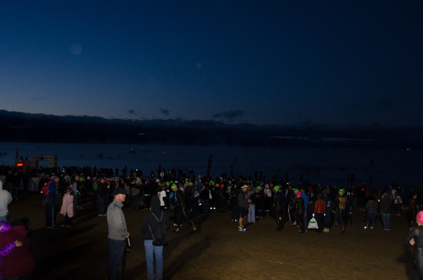 Es ist vier Uhr, also noch weit vor dem Morgengrauen, das Thermometer zeigt zwei Grad unter null - aber es hat aufgehört zu regnen. Ein halbes Dutzend der typischen gelben Schulbusse stehen in Squaw Valley bereit, um die Athleten und Zuschauer zum Startbereich in Kings Beach zu bringen. Dicht gedrängt sitzen auch die anderen ebenfalls dick eingepackten noch müden Frauen und Männer im Bus als gingen sie zum Skilaufen. Durch das Fenster fallen ein paar fahle Streifen der Straßenlaternen und Leuchtreklamen der geschlossenen Lokale vom Straßenrand in den Bus. Eine dösende halbe Stunde später ist der Bus am Schwimmstart in Kings Beach angekommen und ich bin mit einem Schlag hellwach. Grelle Scheinwerfer erleuchten den Athletenbereich.
