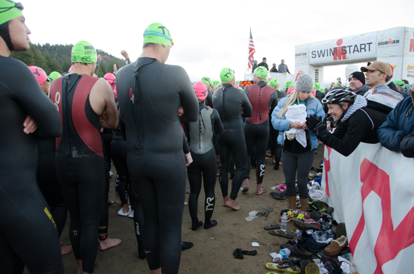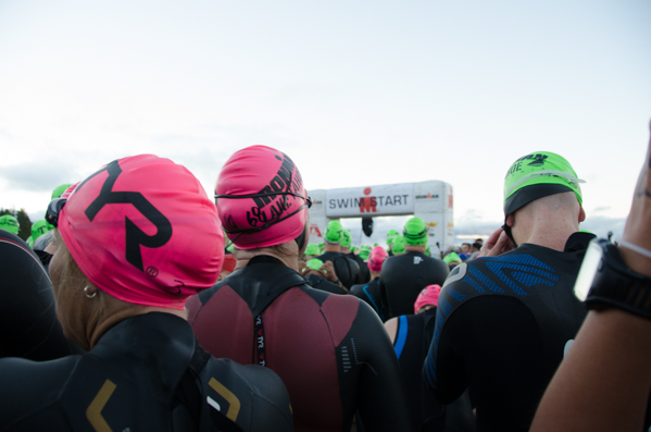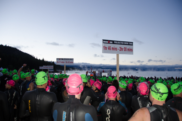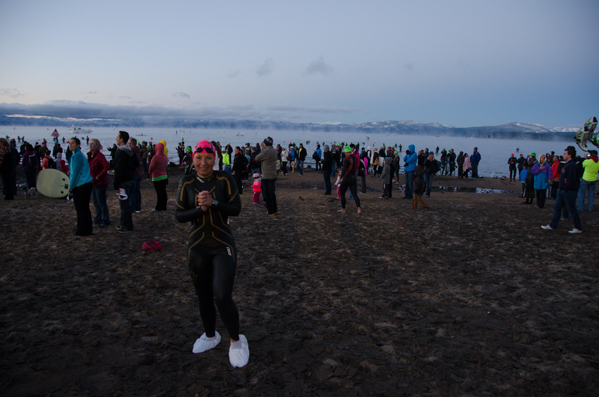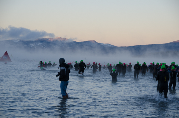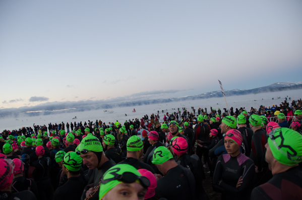 Der Lake Tahoe liegt noch im Dunklen und die Bojen, die die Schwimmstrecke kennzeichnen sollen, hat der dichte Nebel verschluckt. Gleich beginnt am nördlichen Teil des Sees der Schwimmstart. Den Kopf bedecke ich gleich mit zwei Schichten Latex. Wie immer wenn ich starte, ist die offizielle Bademützenfarbe für die Damen knallpink und für die Herren giftgrün.