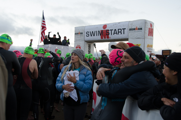 Es ist ein Morgen wie aus dem Bilderbuch. 6:28 Uhr, die Nationalhymne ertönt, wieder einmal live gesungen durch die Lautsprecher und es herrscht kurzzeitig Stille unter den angespannten Athleten. Die Atmosphäre ist unruhig. Der Startschuss rückt immer näher. Noch bevor die Morgensonne über die Kiefernwipfel der Sierra Nevada richtig aufgegangen ist, fällt der fast schon erlösende Startschuss und für uns alle beginnen Stunden der Ungewissheit. Der Schauder dieses Momentes ist einzigartig. Die Traube der Athleten schiebt sich langsam Richtung Starttor bis vor ans Wasser. Erst in letzter Sekunde streift jeder seine Socken, Flip-Flops oder Hotelbadeschuhe ab, sie hielten wenigstens bis zum Start die Füße etwas warm, denn auch der Sand des Strandes ist eiskalt.