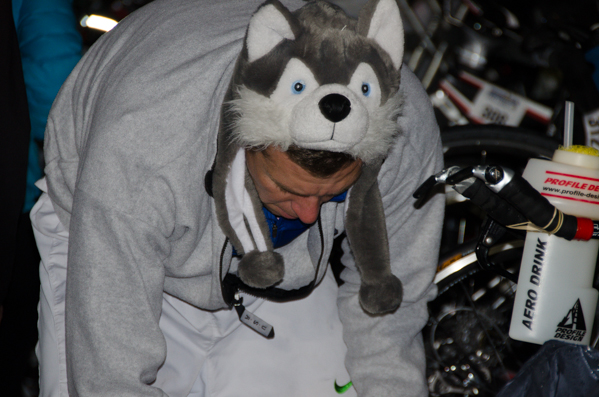 Bevor ich weiß was mit mir geschieht, zupft mir jemand am Hosenbein und fragt mich: „What is your age group?“ und schon habe ich ein schwarzes Bodymarking mit garantiert langer Haftungsdauer auf meine Wade erhalten. Und als ob dies noch nicht genügt, bekomme ich zusätzlich dazu auch noch meine Startnummer auf den Oberarm gemalt. Soweit das Auge reicht stehen hier die Rennräder. Ich bestaune ein besonders stolzes Karbonross. Glänzte früher das Fell der Tiere, funkeln heute Regentropfen auf den teuren Rennboliden. Zwischen den filigranen Rennmaschinen, wirkt mein vor Nässe triefendes Rad wie ein Präriepanzer.