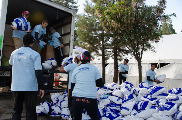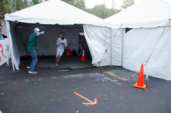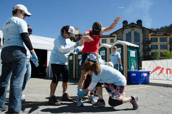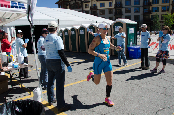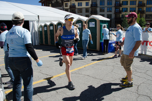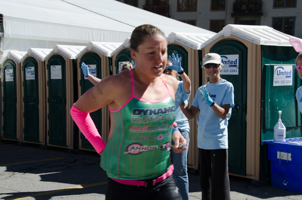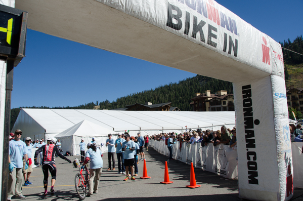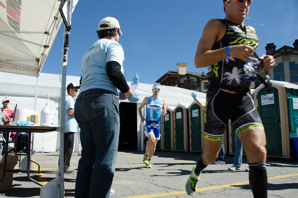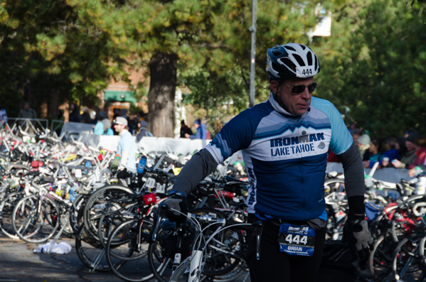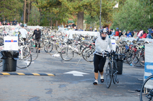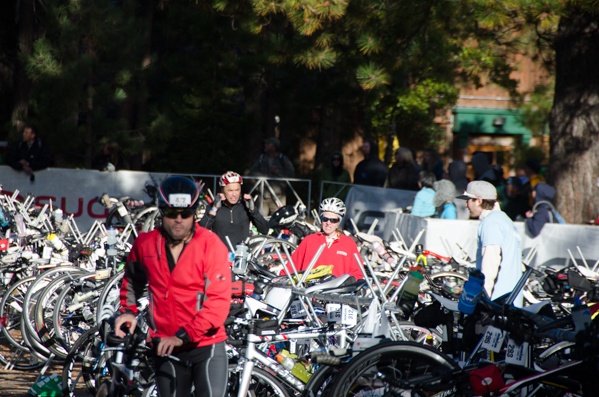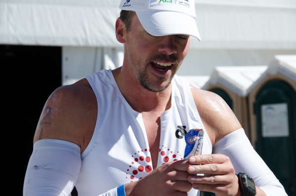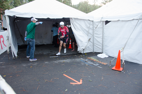 So schön der See auch ist, jeder ist heute bemüht so schnell als möglich wieder aus ihm herauszukommen. Nach und nach erreicht einer nach dem anderen das Seeufer. Nach 1:28 Stunden und damit auf Platz 43 meiner Altersklasse habe auch ich wieder festen Boden unter den Füßen. Ich renne zur Wechselzone und suche meinen Radbeutel. Ohne die Helfer würde man im Chaos der tausend Kleiderbeutel untergehen. Rasch bekomme ich meinen Beutel mit den Radsachen darin in die Hand gedrückt und laufe in Richtung Wechselzelt. Noch bevor ich reagieren kann, zerren zwei andere Helfer an mir. Sie streifen mir den Neoprenanzug ab wie eine Schlangenhaut. Gehäutet und zitternd vor Kälte versuche ich ein paar Zentimeter Platz in dem überfüllten und dunklen Wechselzelt zu erhaschen. Jedoch keine Chance auf einen Sitzplatz.