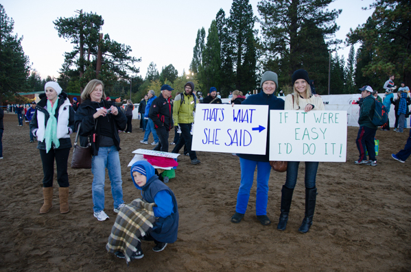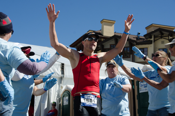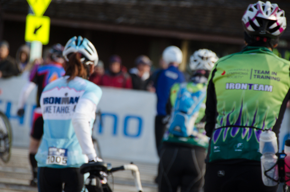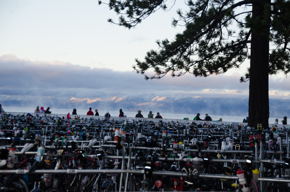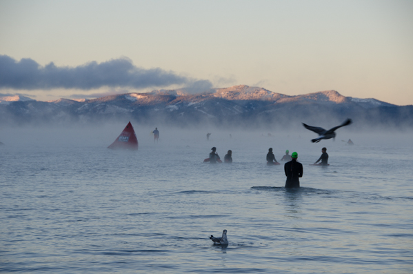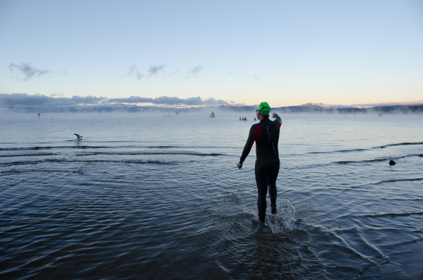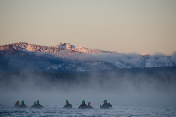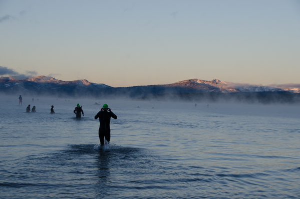 Ich drücke Natascha wie zum Abschied. Es gibt nicht mehr viel zu sagen. Ich hole nochmal Luft. Das kalte Wasser ist wie ein Weckruf für meine Blutkörperchen. Ganz langsam läuft das Wasser in den Neopren, kühlt kurze Zeit die Emotionen. Die Zeit läuft. Wir schwimmen zwei Runden gegen den Uhrzeigersinn. Am Rande des Sees jubeln die Zuschauer, Sponsoren, Helfer. Brustschwimmend wage ich die ersten Züge, traue mich nicht das Gesicht in das kalte Wasser zu tauchen. Endlich kreiseln zaghaft meine Arme durch das Wasser, ich habe Angst keine Luft zu bekommen, will einfach nur heil durchkommen. Trotz der Kälte fange ich an es zu genießen. Verzaubernder als die aus dem Nebelmeer steigende und schneebedeckte Bergkette der Sierra Nevada kann ein Bild von dieser Welt nicht sein.